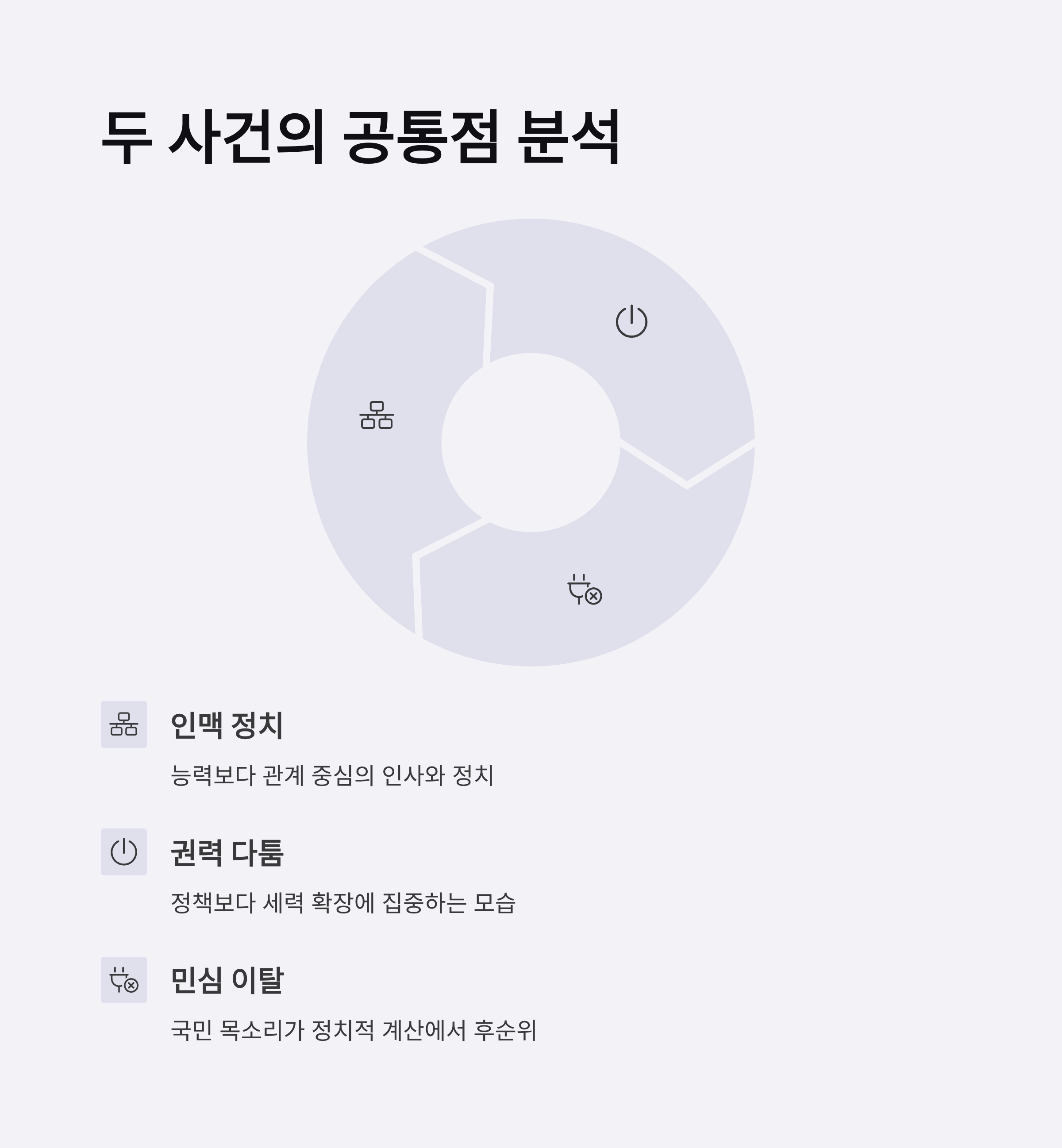 - 두 사건 모두 사적 인맥과 권력 다툼 중심으로, 본질적 국민 관심과 동떨어짐.