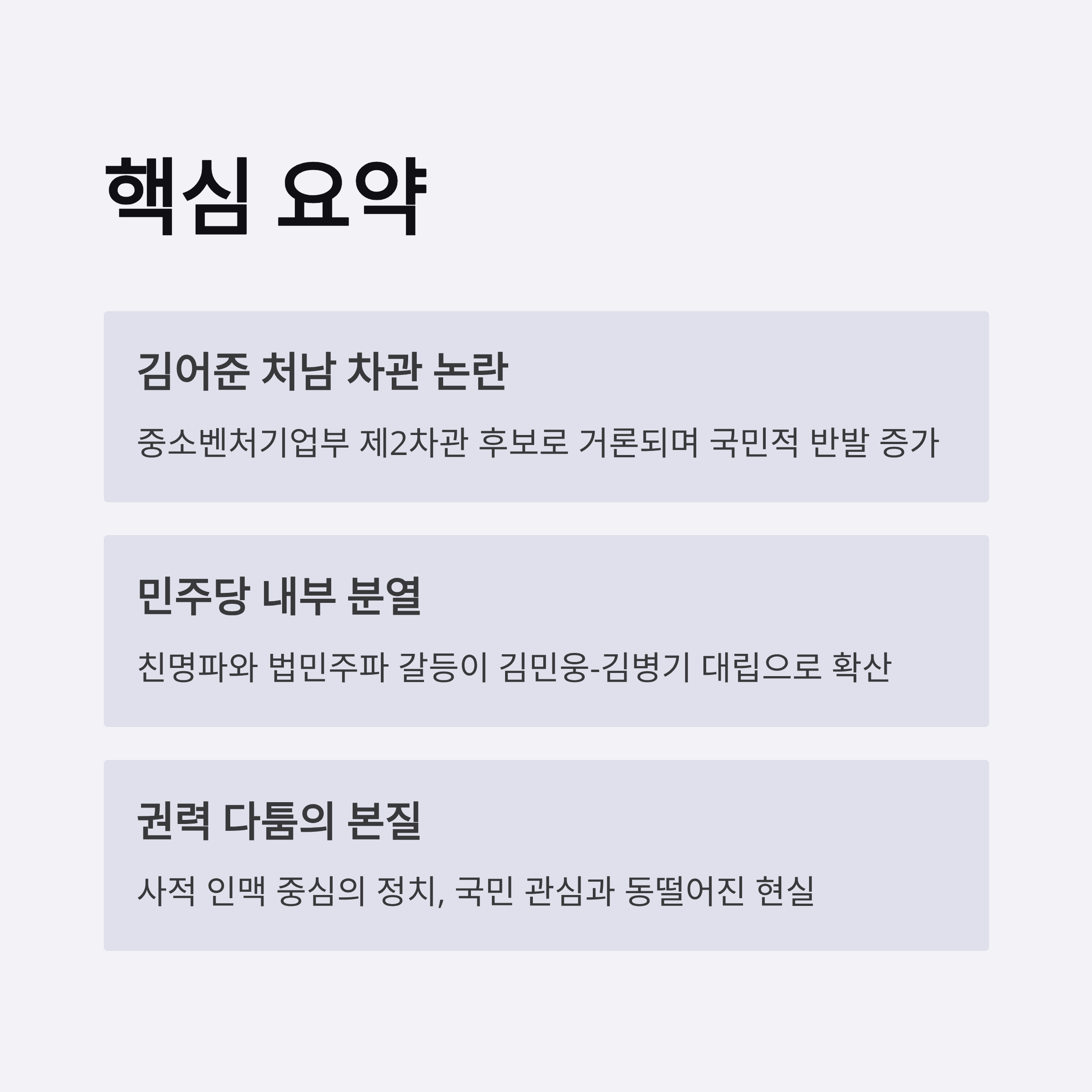 대한민국 정치는 끊임없이 새로운 사건과 논란을 만들어내며 국민들의 관심을 집중시킵니다. 최근 주목받는 두 가지 사건이 있습니다. 첫째는 김어준 처남으로 알려진 인태현 전 자영업 비서관이 중소벤처기업부 제2차관 자리에 유력 후보로 거론되고 있다는 소식입니다. 이는 정치적 인맥과 적합성 논란을 불러일으키며 국민적 반발을 사고 있습니다. 둘째는 민주당 내부 갈등이 표면화된 사건으로, 김민웅 시민단체장의 공개 발언이 김병기 민주당 원내대표를 강하게 비판한 것입니다.