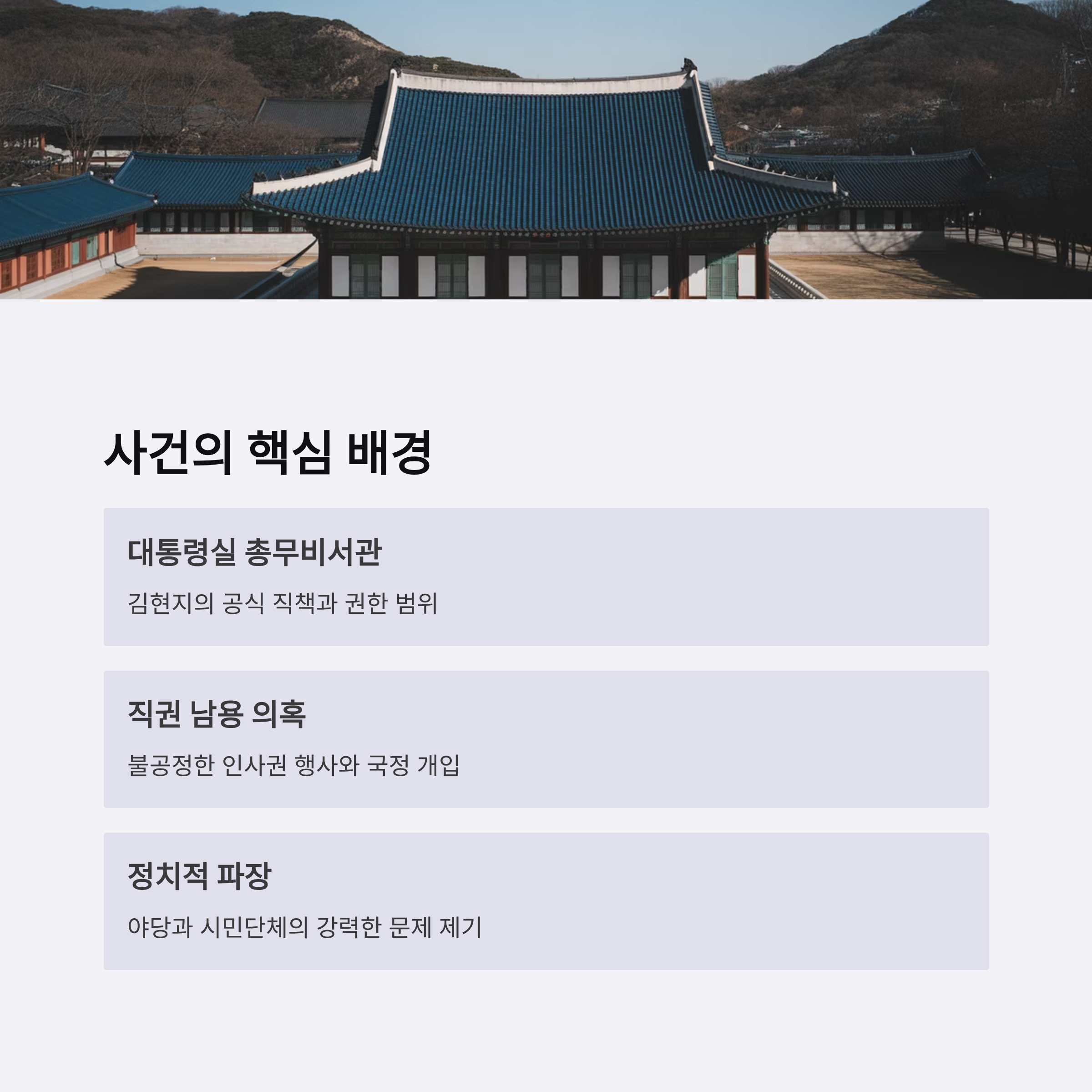 김현지의 고발 사건은 단순한 개인 사안이 아닌 높은 수준의 정치적, 국정적 파장을 일으킬 수 있는 사건으로 주목을 받고 있습니다. 그녀가 대통령실 총무비서관으로 재직하는 동안 직권 남용, 국정 운영 개입, 그리고 인적 네트워크를 통해 불공정하게 인사권을 행사했다는 의혹이 제기되었습니다. 이는 국회의 신뢰를 흔드는 행위로 비판받으며, 야당과 시민단체가 강하게 문제를 제기한 여러 사례 중 가장 심각한 사안으로 부각되고 있습니다.