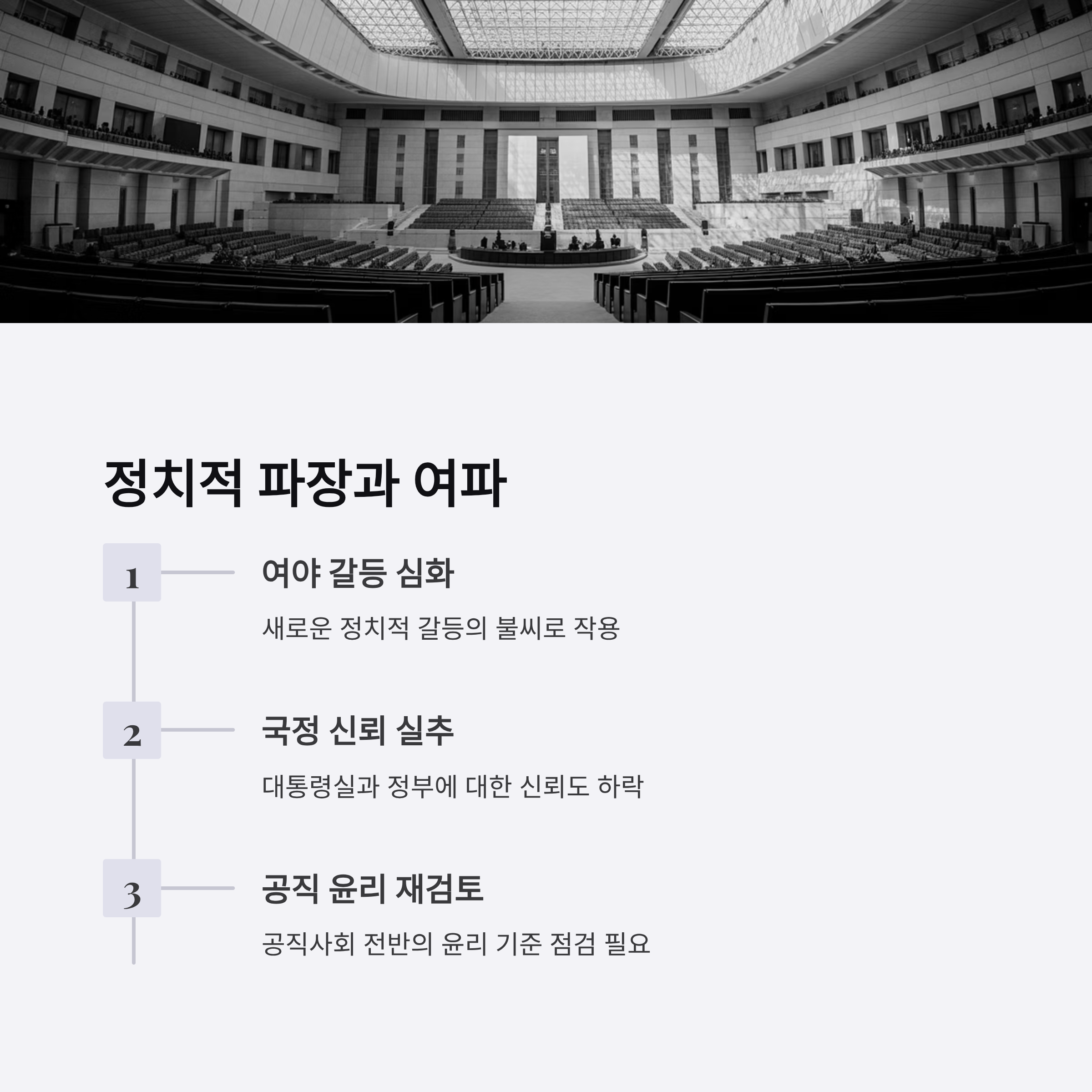 5. 이번 사건은 국정 농단과 국가 정책 신뢰 훼손의 중심에서 여러 정치적 파장을 불러일으킬 가능성이 높습니다.