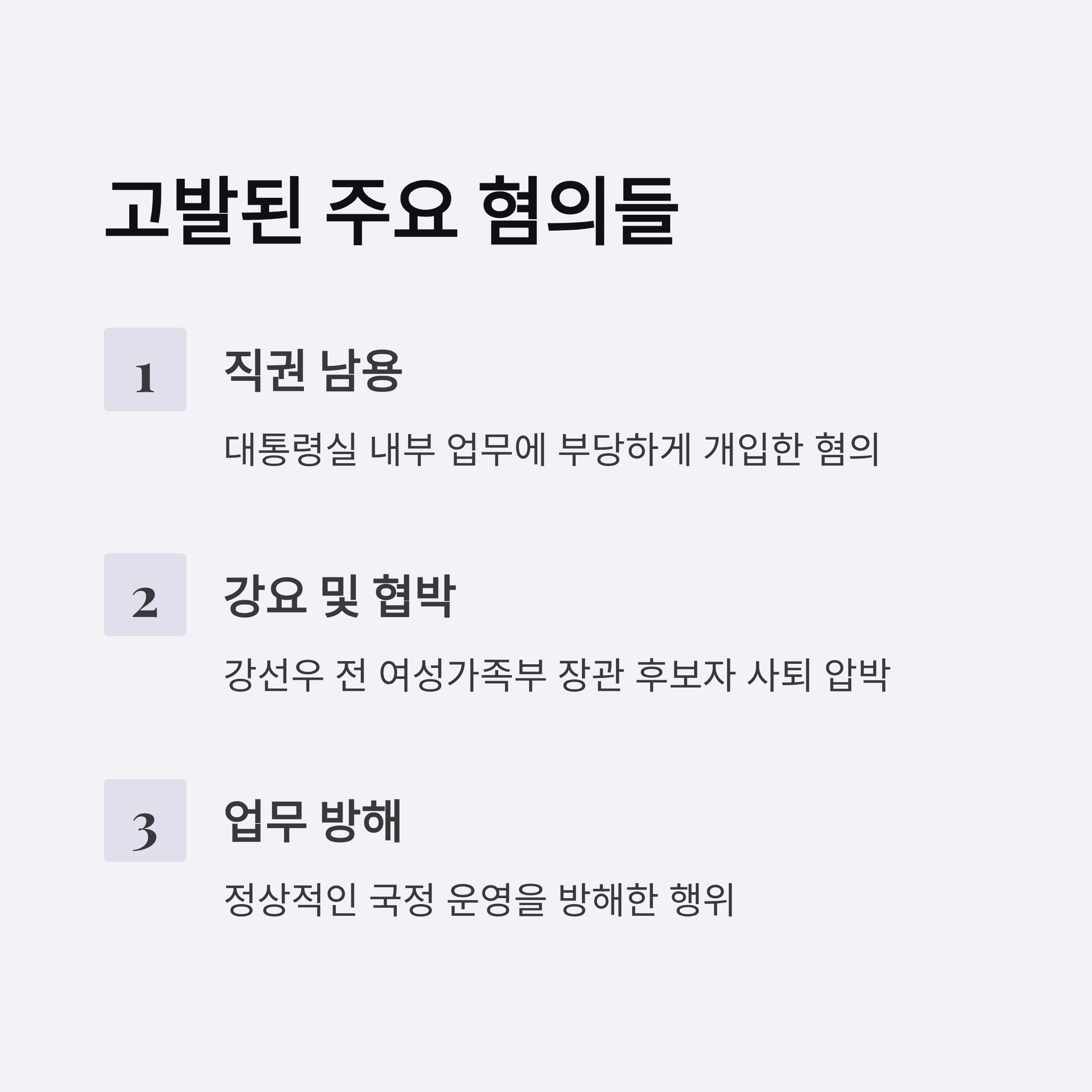2. 혐의는 대통령실 내부에서의 불투명한 인사 개입, 국정 업무 처리, 그리고 강압적 행동에 대한 내용이 포함됩니다.
