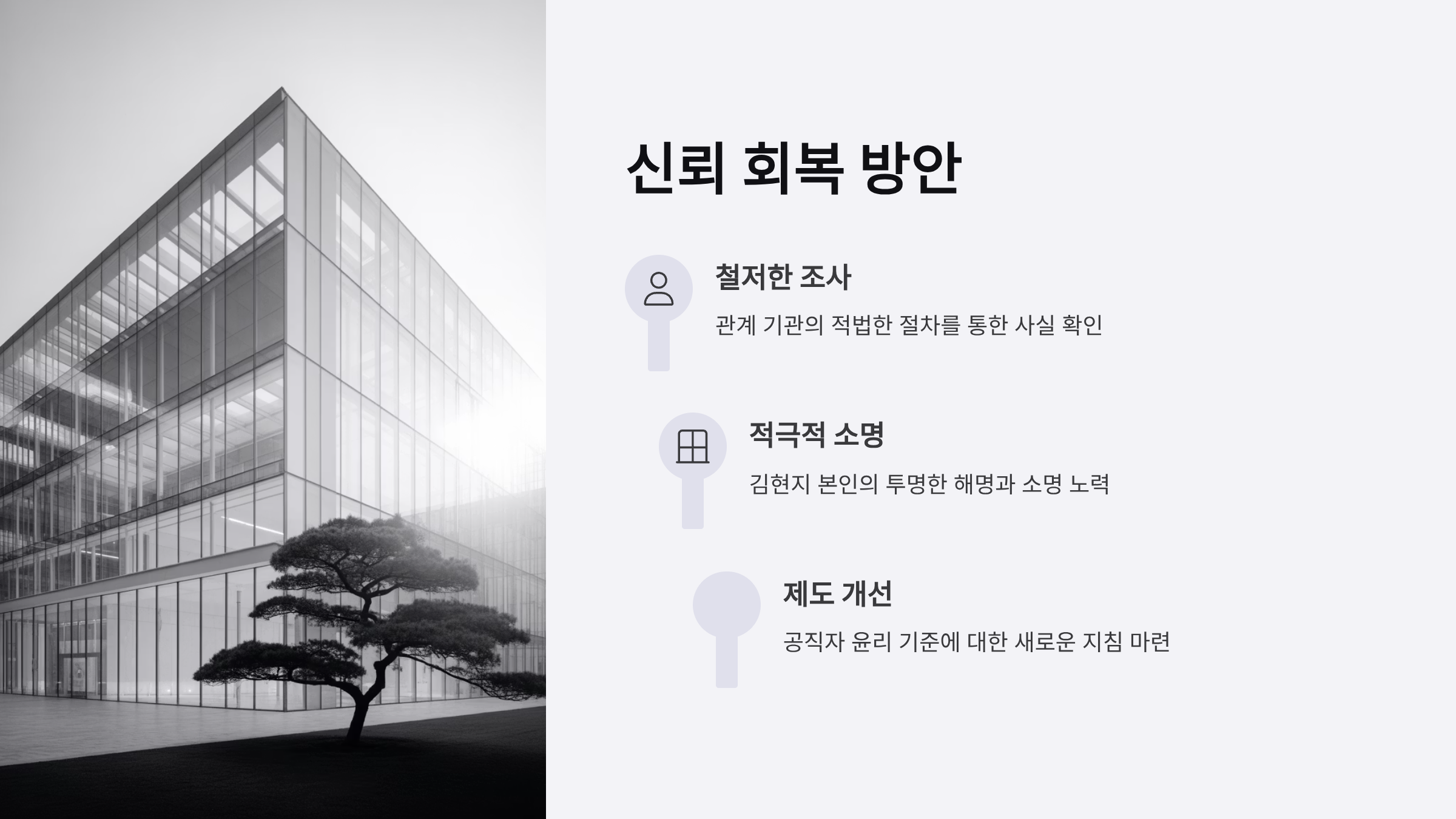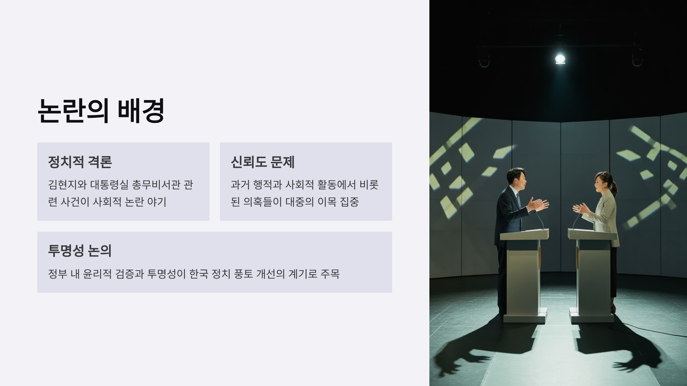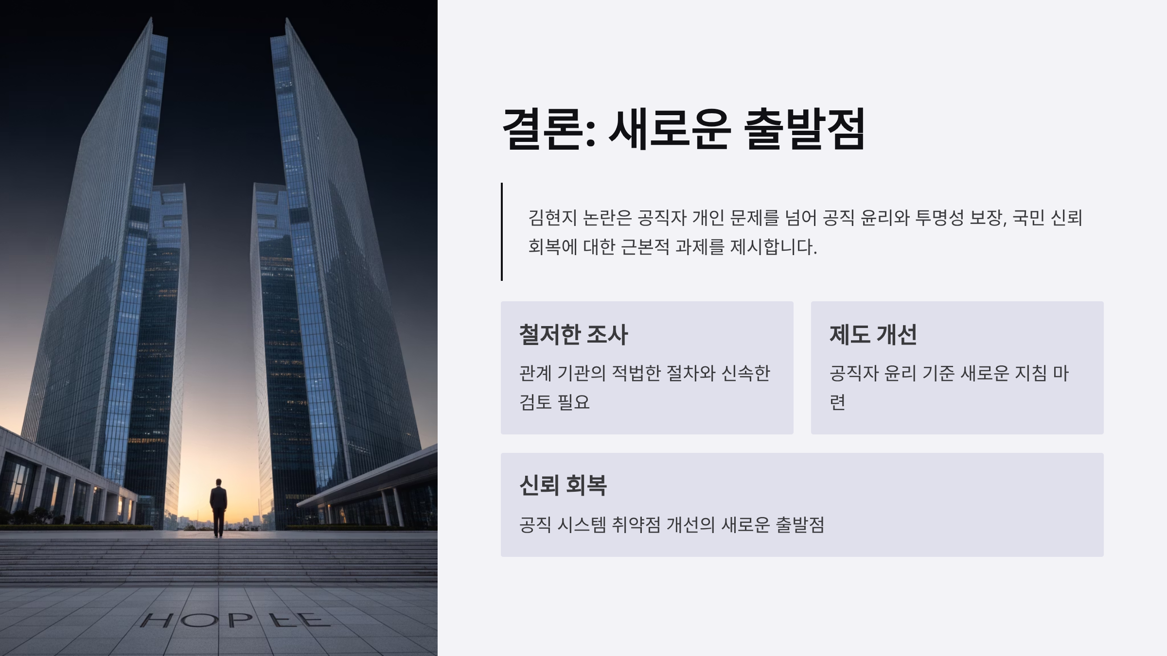 김현지 논란은 단순한 공직자 개인 문제를 넘어, 공직자의 윤리와 투명성을 어떻게 보장하고 국민 신뢰를 회복할 것인지에 대한 문제로 확산되고 있다. 논란의 종식과 동시에 공직자의 정치적 중립성을 강화하기 위해 관계 기관의 철저한 조사와 적법한 절차가 필요하다.