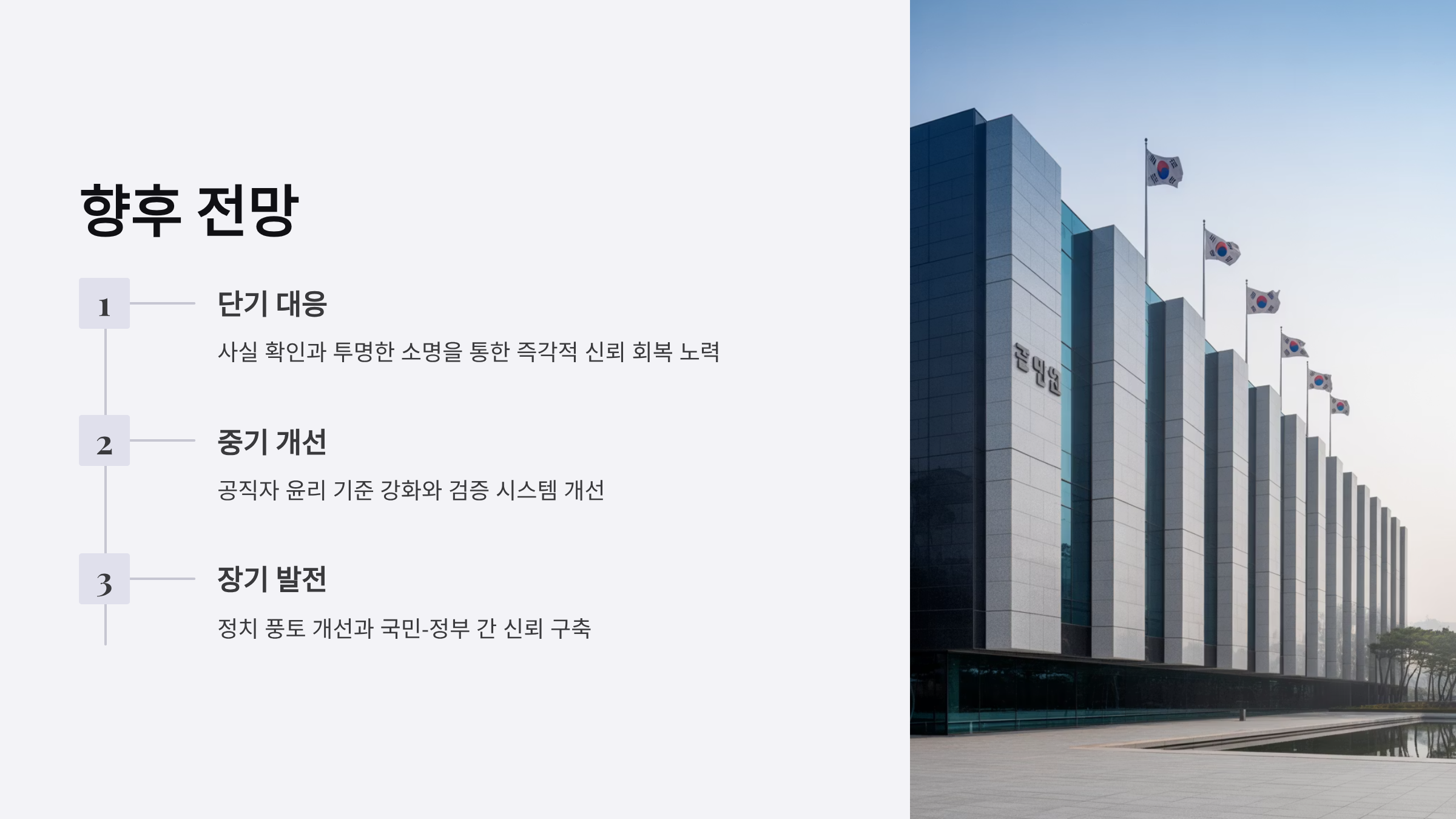 또한, 국민들의 신뢰를 얻기 위해 김현지 본인의 적극적인 소명 노력과 정부 차원의 신속한 다각 검토가 요구된다. 이러한 과정을 통해 공직자의 윤리 기준에 대한 새로운 지침을 마련할 필요성이 강조된다. 김현지 사건은 공직 시스템의 취약점을 노출함과 동시에 이를 개선할 새로운 출발점이 될 수 있을 것이다.