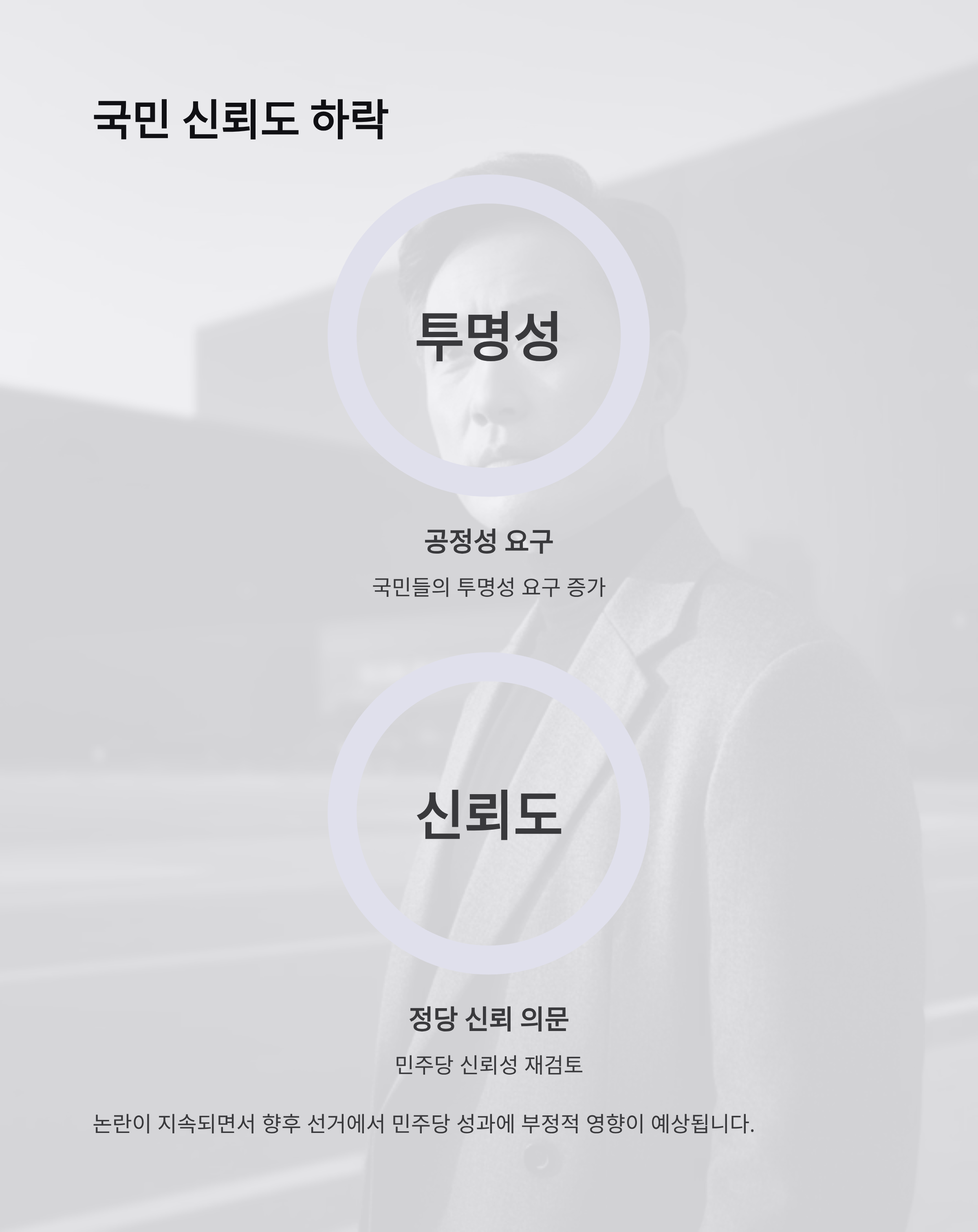 | A. 반복되는 논란은 민주당의 리더십에 지속적 부담을 주며, 대중과 내부 조직 모두에서 신뢰 회손 문제를 야기할 가능성이 큽니다. |