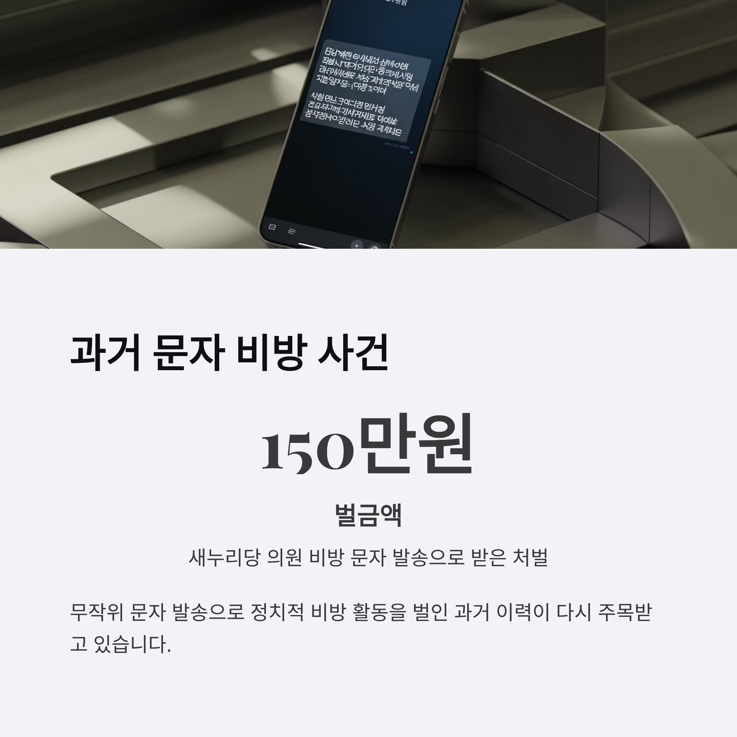 ● 과거 새누리당 의원 비방 무작위 문자 발송 사건으로 150만 원의 벌금을 받은 이력이 다시금 화제입니다.