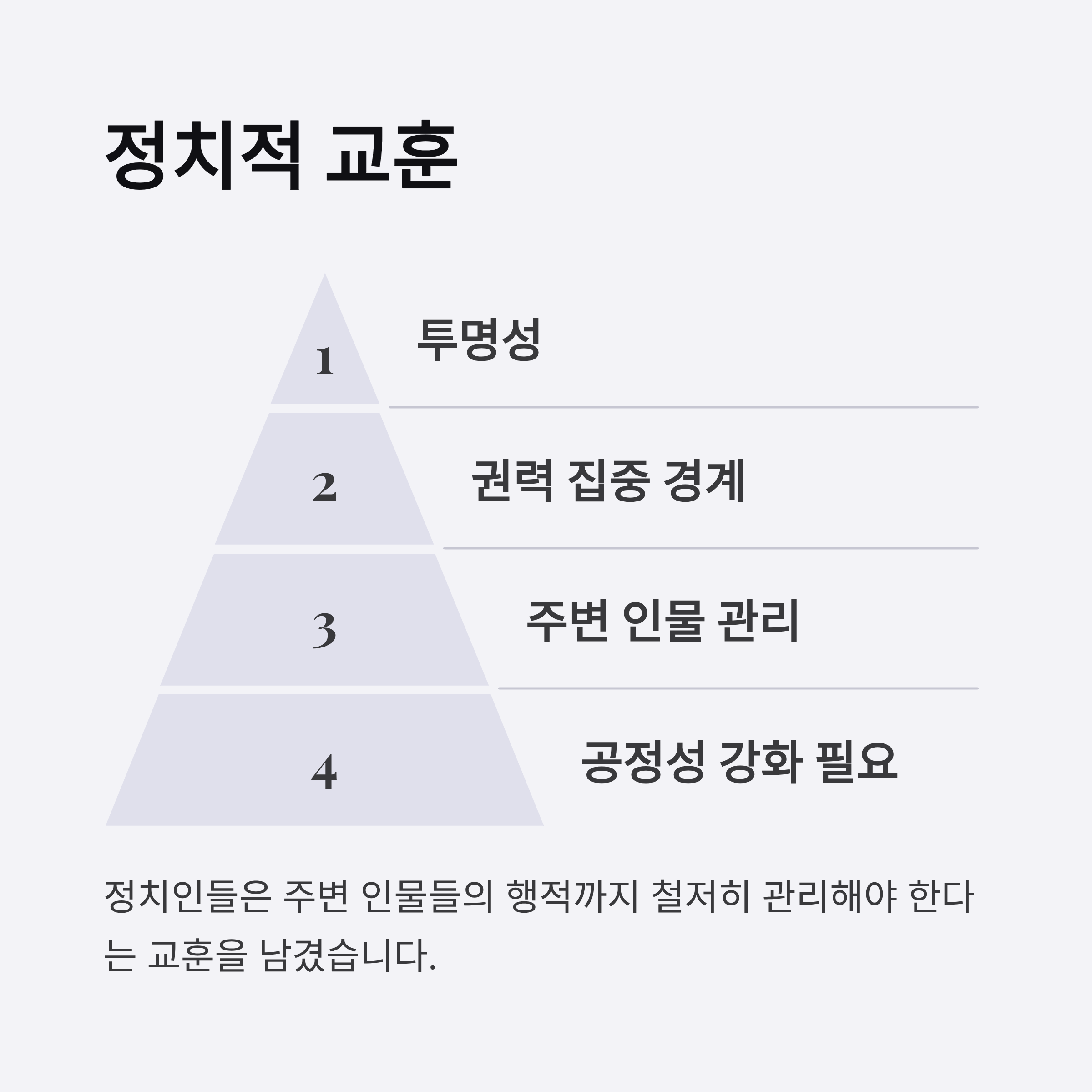 김현지 논란은 권력 집중과 주요 직무의 투명성이 얼마나 중요한지 보여준다. 그녀와 이재명 대표 간 긴밀한 관계가 확인된 만큼, 이 사건은 정치인들이 주변 인물들의 행적까지 철저히 관리해야 한다는 점을 시사한다. 공정성과 투명성 강화는 정치적 체계의 신뢰를 높이는 기본 요소이며, 이를 지키는 것은 향후 정치적 논란을 줄이는 데 중요한 역할을 할 것이다.