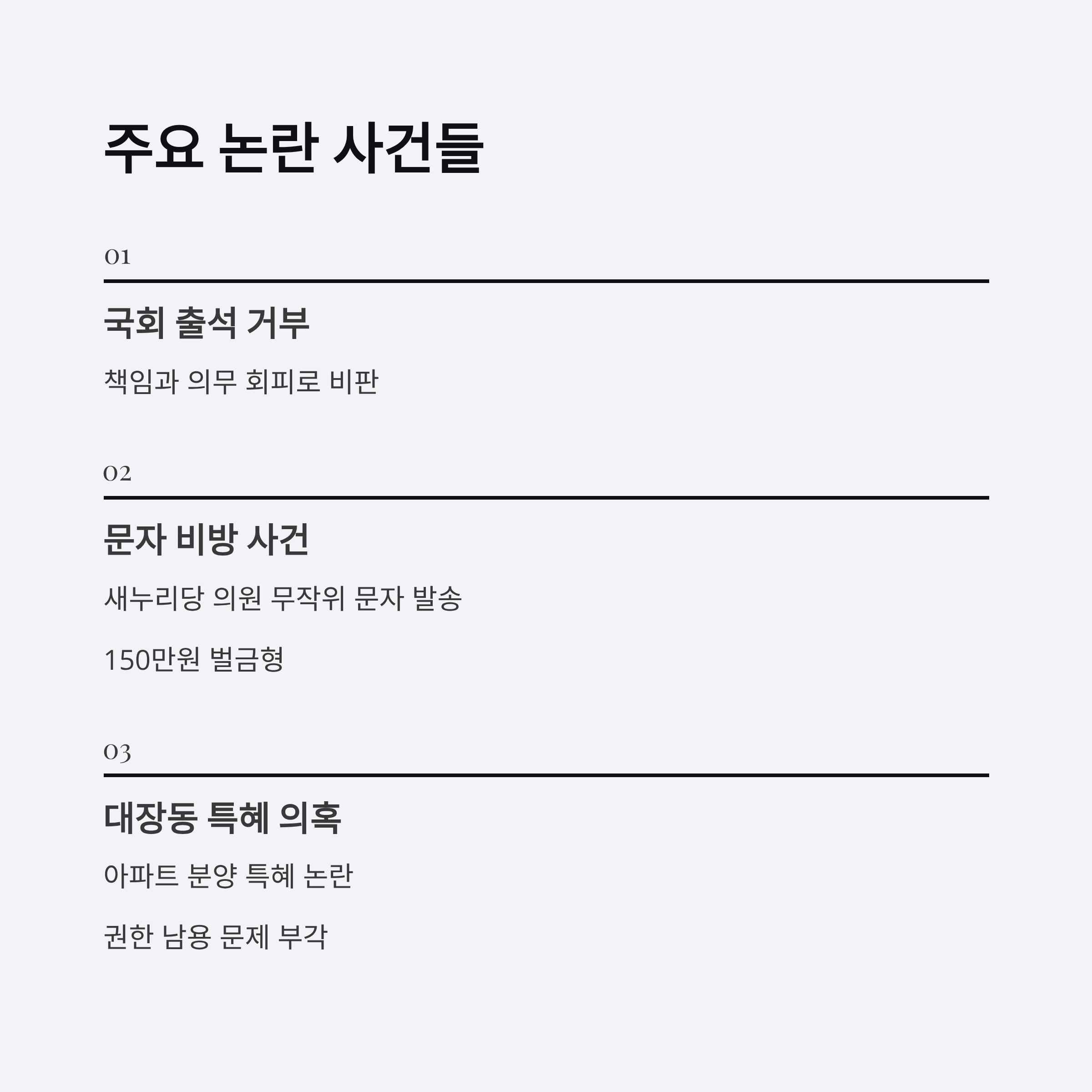 ● 대장동 아파트 특혜 분양 의혹은 그녀의 권한 남용 문제를 부각시키고 있습니다.