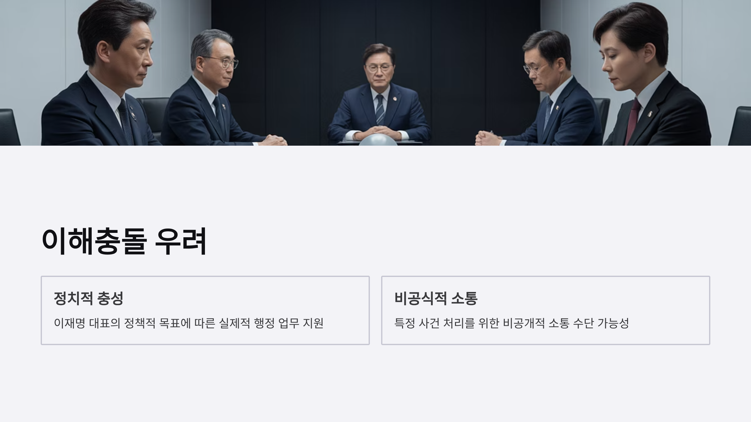 그러나 장기적인 협력이 오히려 정치적 이해충돌의 소지가 있다는 우려도 존재합니다. 그녀의 대통령실 내 활동 방식과 이는 이 대표의 과거 행적과 맞물려, 정책 추진 과정 또는 특정 사건 처리를 위한 비공식적/비공개적 소통의 수단일 가능성이 제기되며 의혹을 키우고 있는 것입니다.