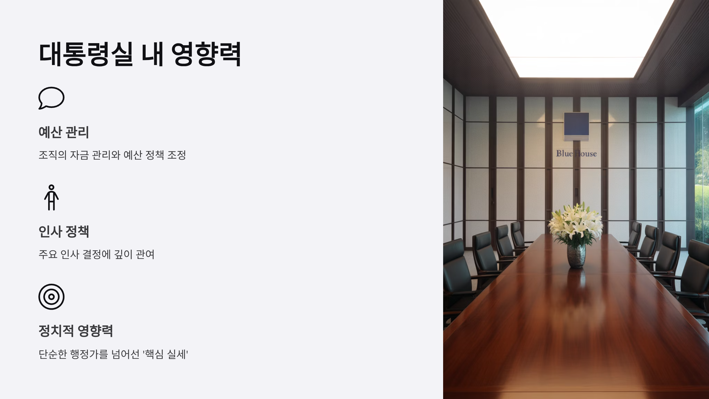 김현지는 대통령실에서 총무비서관으로 일하며 조직의 예산, 자금 관리, 인사 정책 조정 등 중요한 역할을 수행해왔습니다. 그녀는 단순히 행정 업무를 담당하는 조력자에 머무르지 않고, 주요 인사 결정에 깊이 관여했다는 의혹을 받고 있습니다. 이는 특정 장관이 갑작스럽게 사임하도록 유도했다고 보도된 사례에서도 드러납니다. 이러한 모습은 단순한 행정가가 아닌 정치적 영향력을 가진 '핵심 실세'로서의 면모를 보여줍니다.