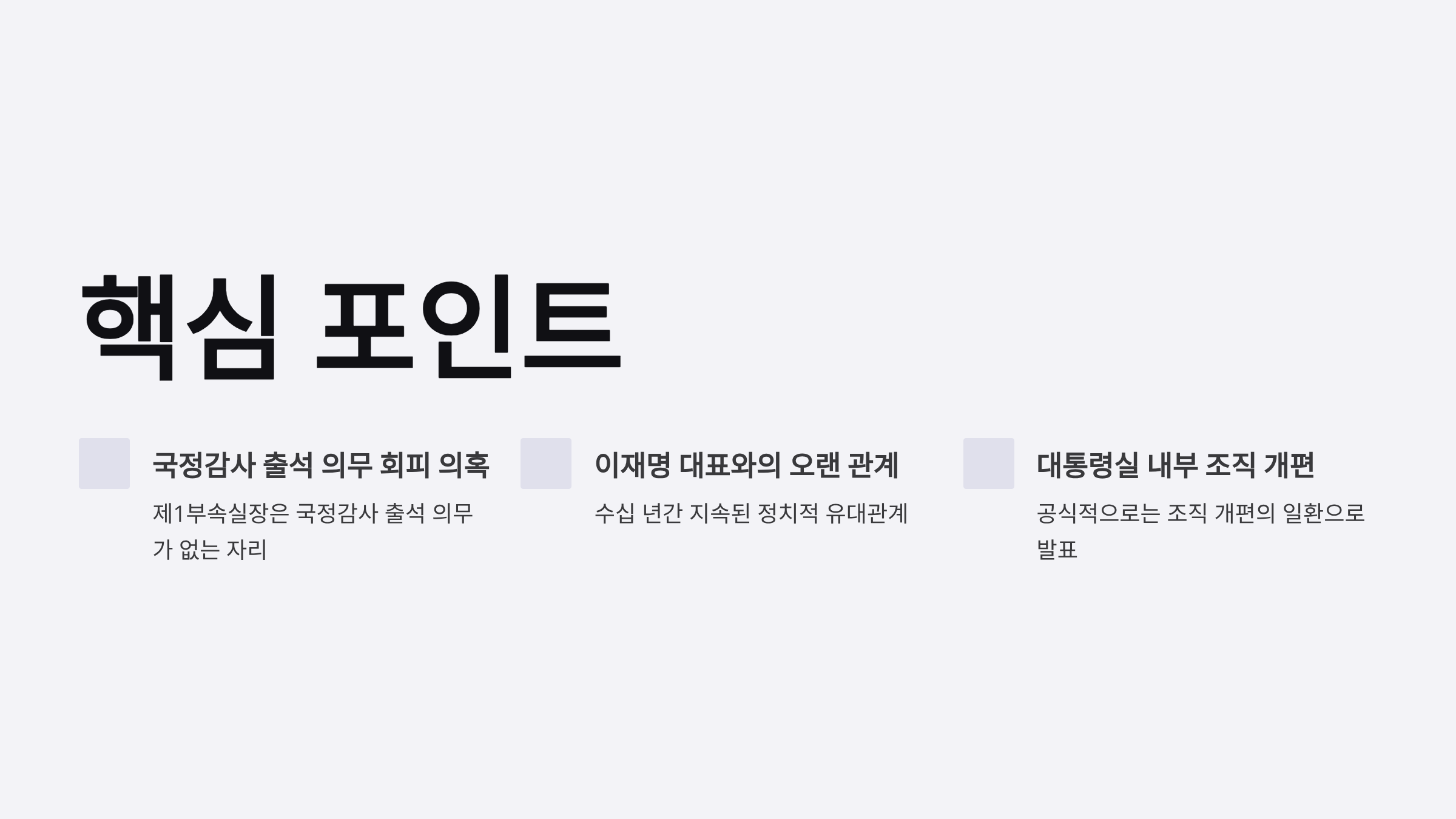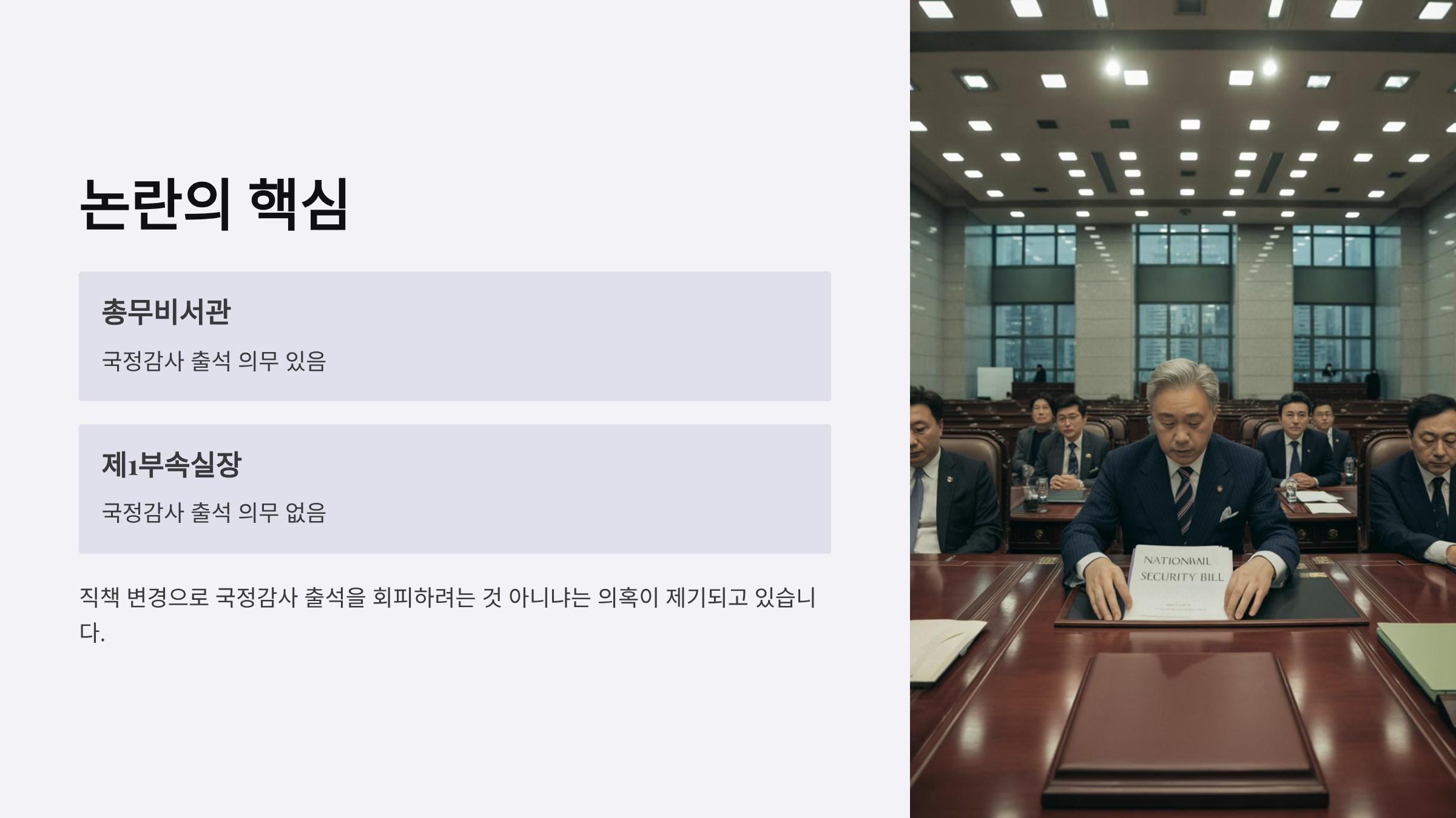 본 이동은 대통령실 내부 조직 개편의 일환으로 발표되었으나, 일부에서는 이를 출석 회피로 간주하고 있습니다.