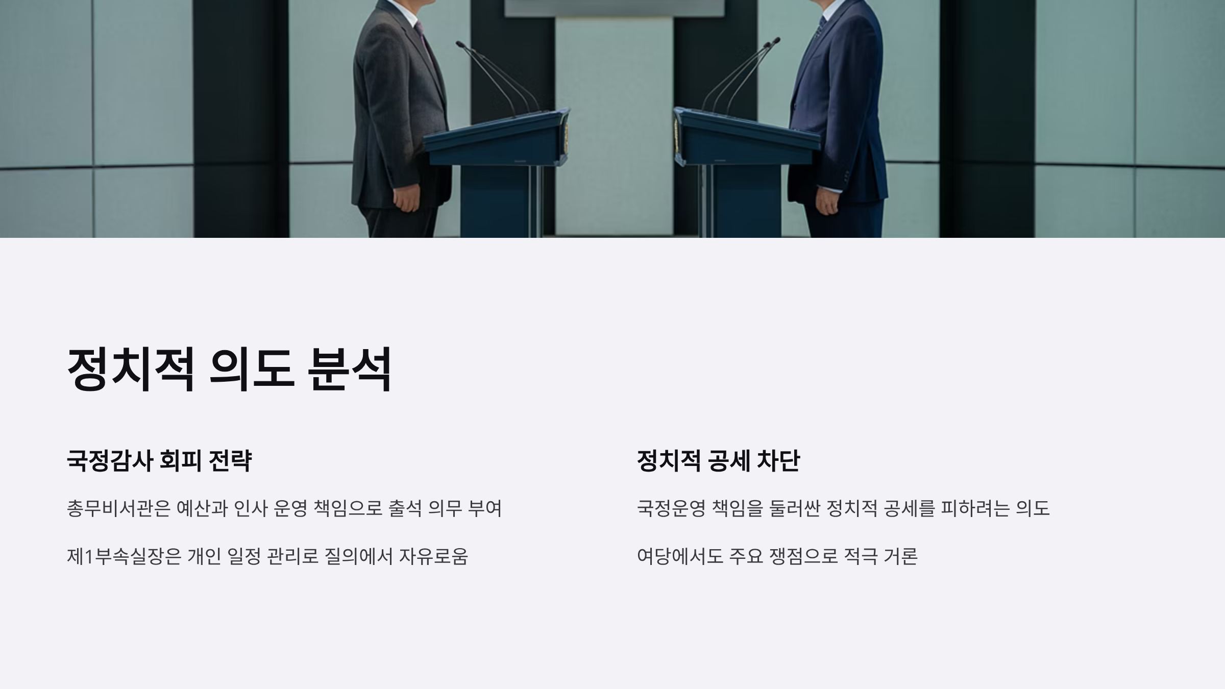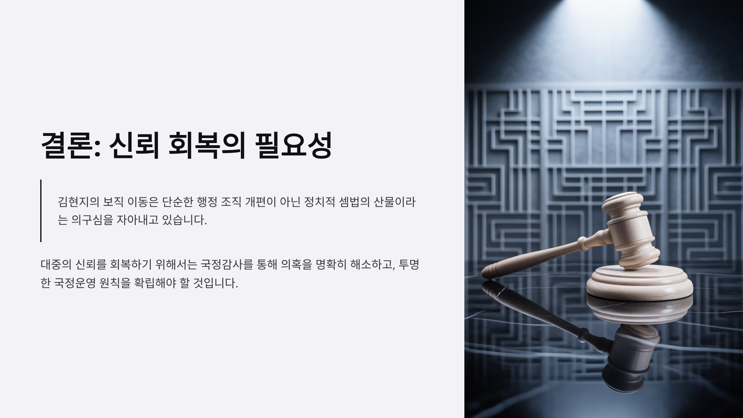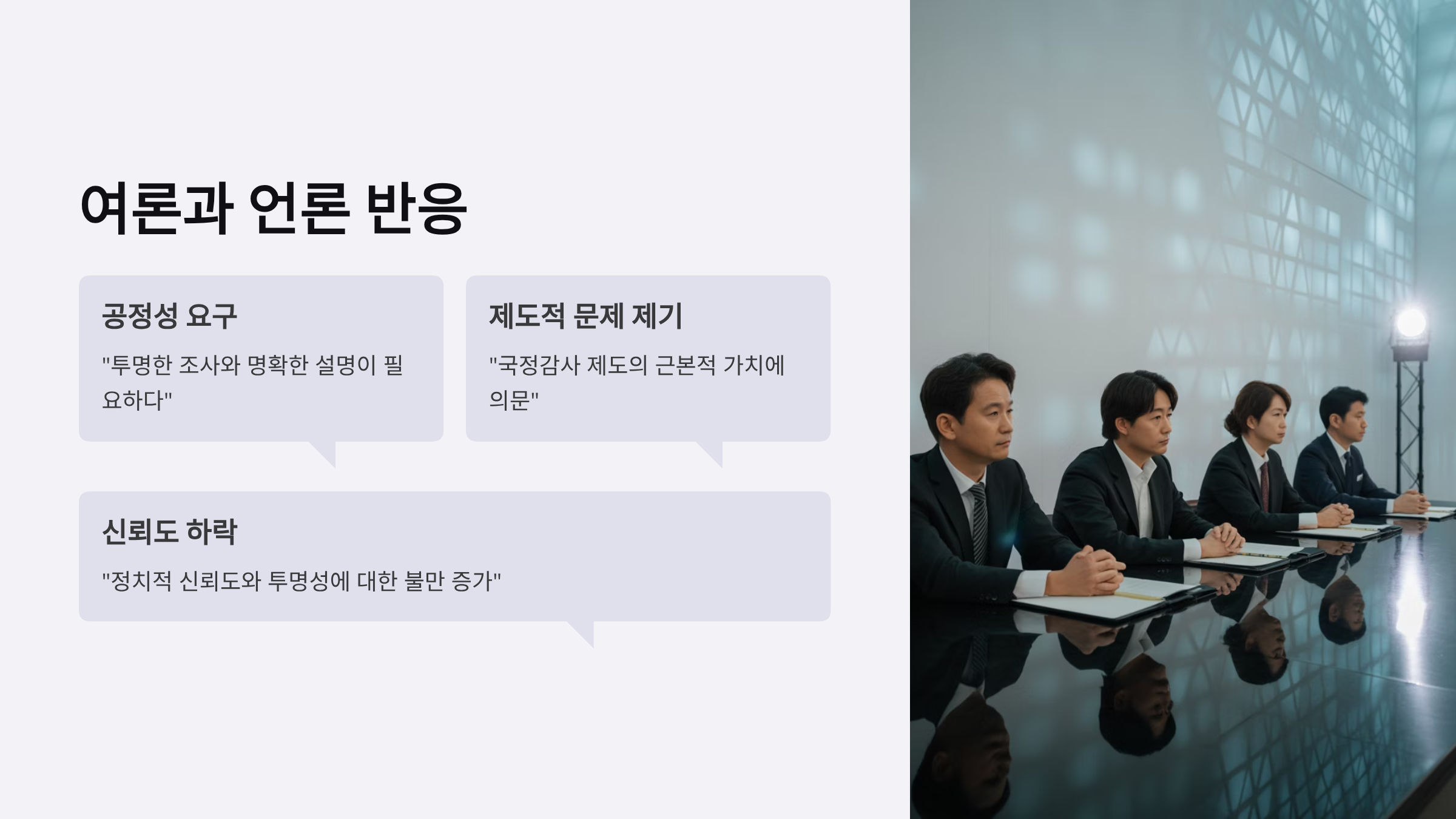 일각에서는 대통령실이 이러한 이동을 통해 국정운영의 일부 책임을 둘러싼 정치적 공세를 손쉽게 피하려 한다고 평가하고 있으며, 여당에서도 이 문제를 주요 쟁점으로 적극적으로 거론하고 있습니다. 이러한 흐름은 결과적으로 국정감사 제도의 배경과 근본적 가치에 의문을 제기하게 만들고, 정치적 신뢰도와 투명성에 대한 대중적 불만을 초래하고 있습니다.