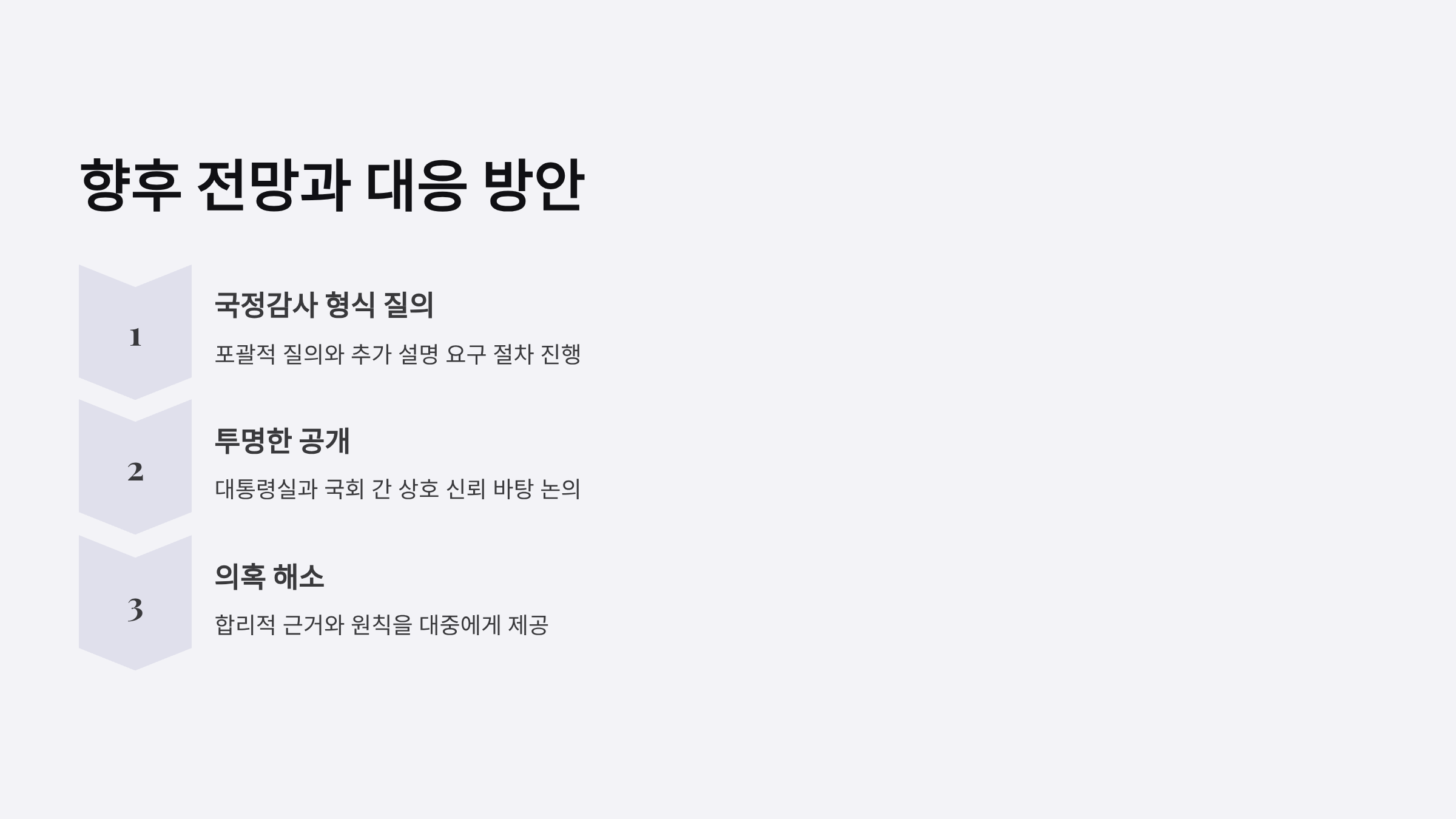 이 논란을 해결하기 위해서는, 대통령실과 국회가 상호 신뢰를 바탕으로 관련 사항을 투명하게 공개하고 논의하는 장이 마련되어야 합니다. 대중의 신뢰를 회복하기 위해서는 무엇보다도 국정감사를 통해 의혹을 명확히 해소하며 합리적인 근거와 원칙을 대중에게 제공해야 할 것입니다.