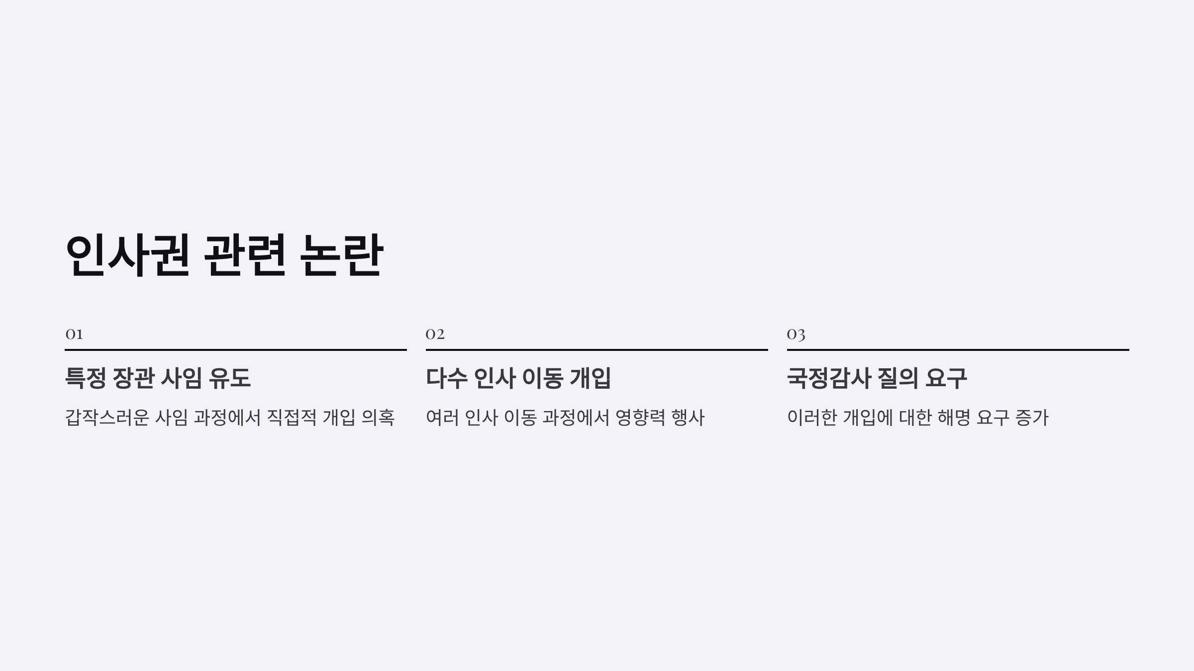 특히 인사권 관련 이슈는 그녀의 정치적 위상을 강화하면서도, 동시에 논란을 불러일으키고 있습니다. 다수의 인사 이동 과정에서 그녀의 직접적 개입이 있었다는 주장이 제기됨에 따라, 국정감사 출석이 요구되었지만, 이번 보직 이동은 이러한 질의를 원천적으로 피하려는 의도로 간주되고 있습니다.