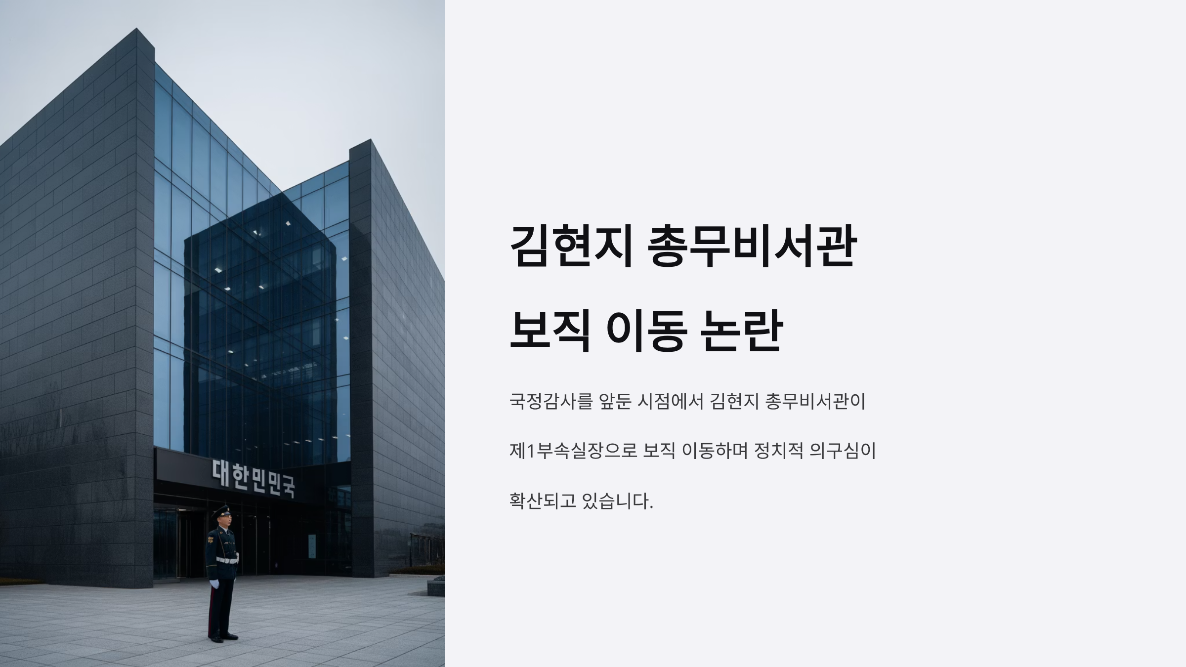 최근 대통령실에서 발표된 주요 인사 이동이 대중의 큰 주목을 받고 있습니다. 김현지 총무비서관이 국정감사를 앞둔 시점에서 제1부속실장으로 보직 이동하면서 이를 둘러싼 논란이 확산되고 있습니다. 특히, 총무비서관 직책은 국회 국정감사에 출석 의무가 있는 자리인 반면, 제1부속실장은 이를 요구받지 않는데요. 이에 따라 여론은 본 이동이 정치적 목적을 가진 것이 아니냐는 의구심을 제기하고 있습니다. 김현지는 성남시청 시절부터 이재명 대표와의 밀접한 관계로도 유명하며, 그녀가 대통령실 안에서 인사와 예산 등 주요 사안을 좌우하고 있다는 주장은 더욱 논란을 증폭시키고 있습니다. 이 글에서는 김현지 씨의 보직 변경 배경 및 세부 사항을 정리하고, 정치적 의혹과 그 파장을 다각도로 분석하고자 합니다.