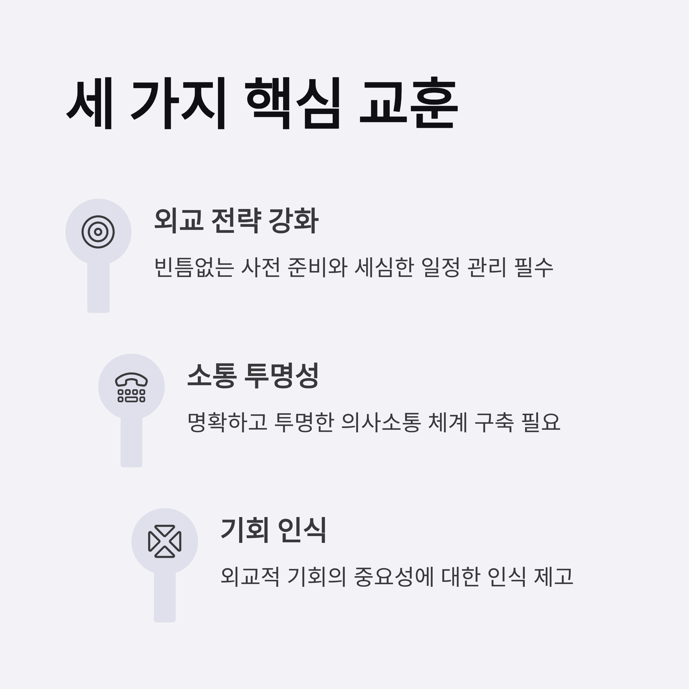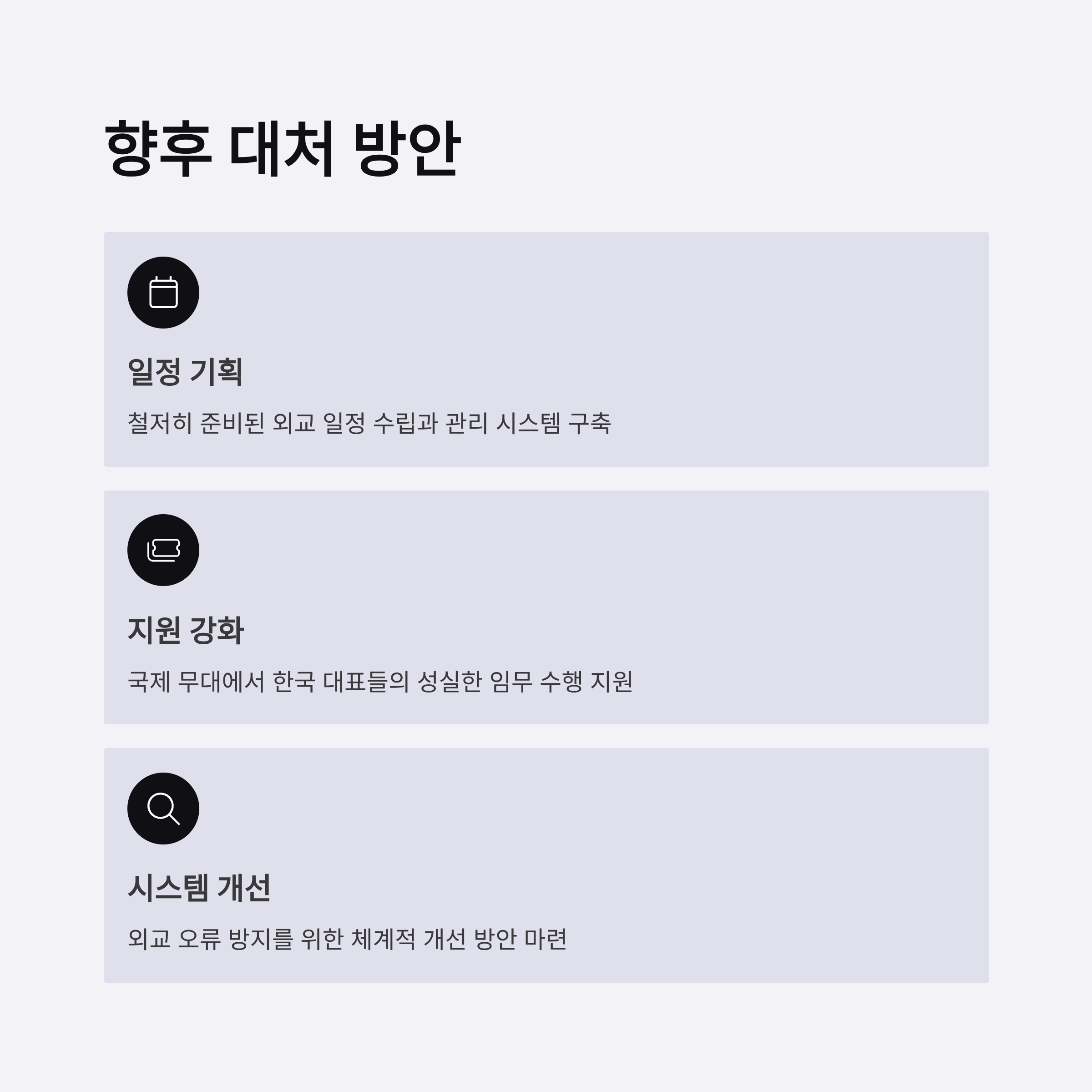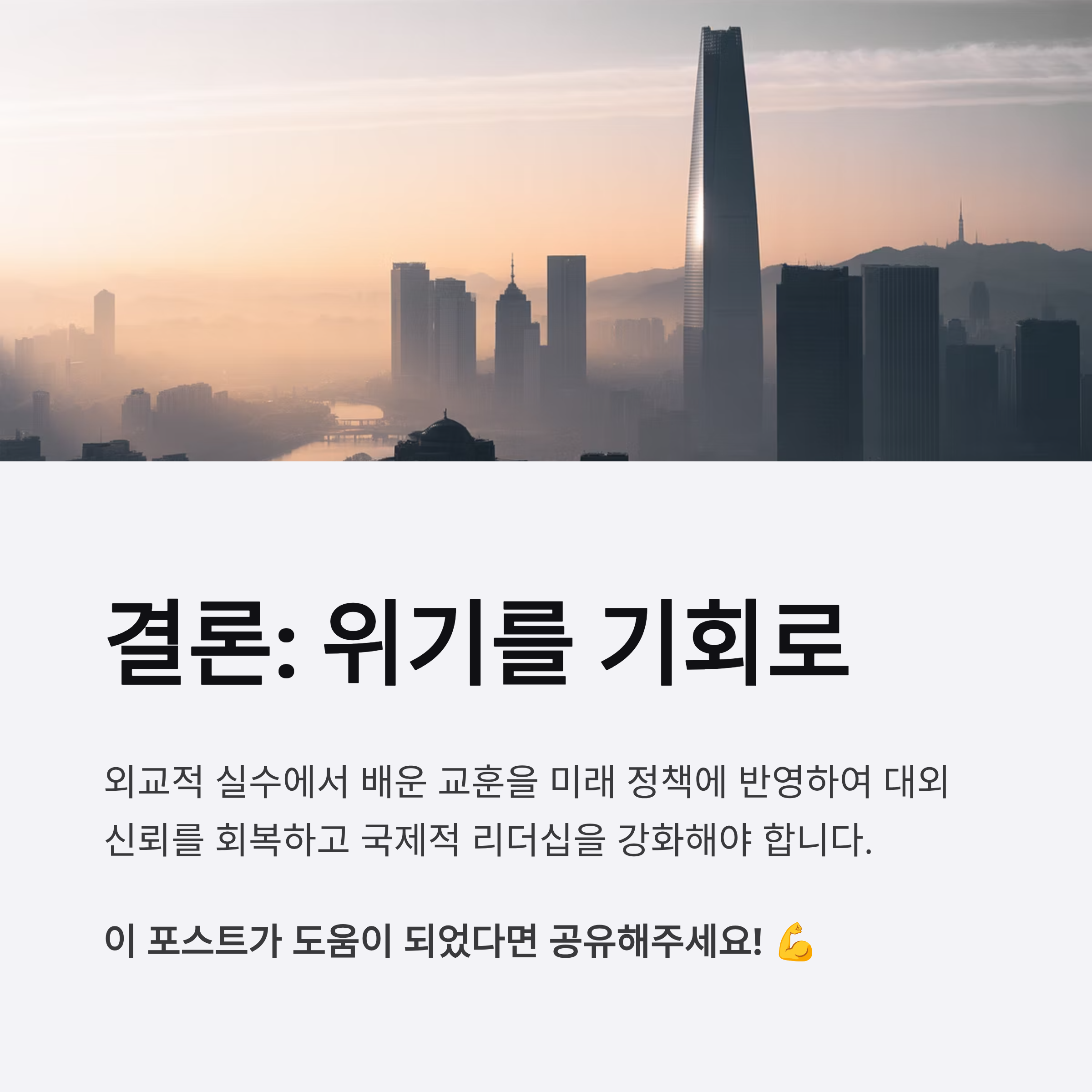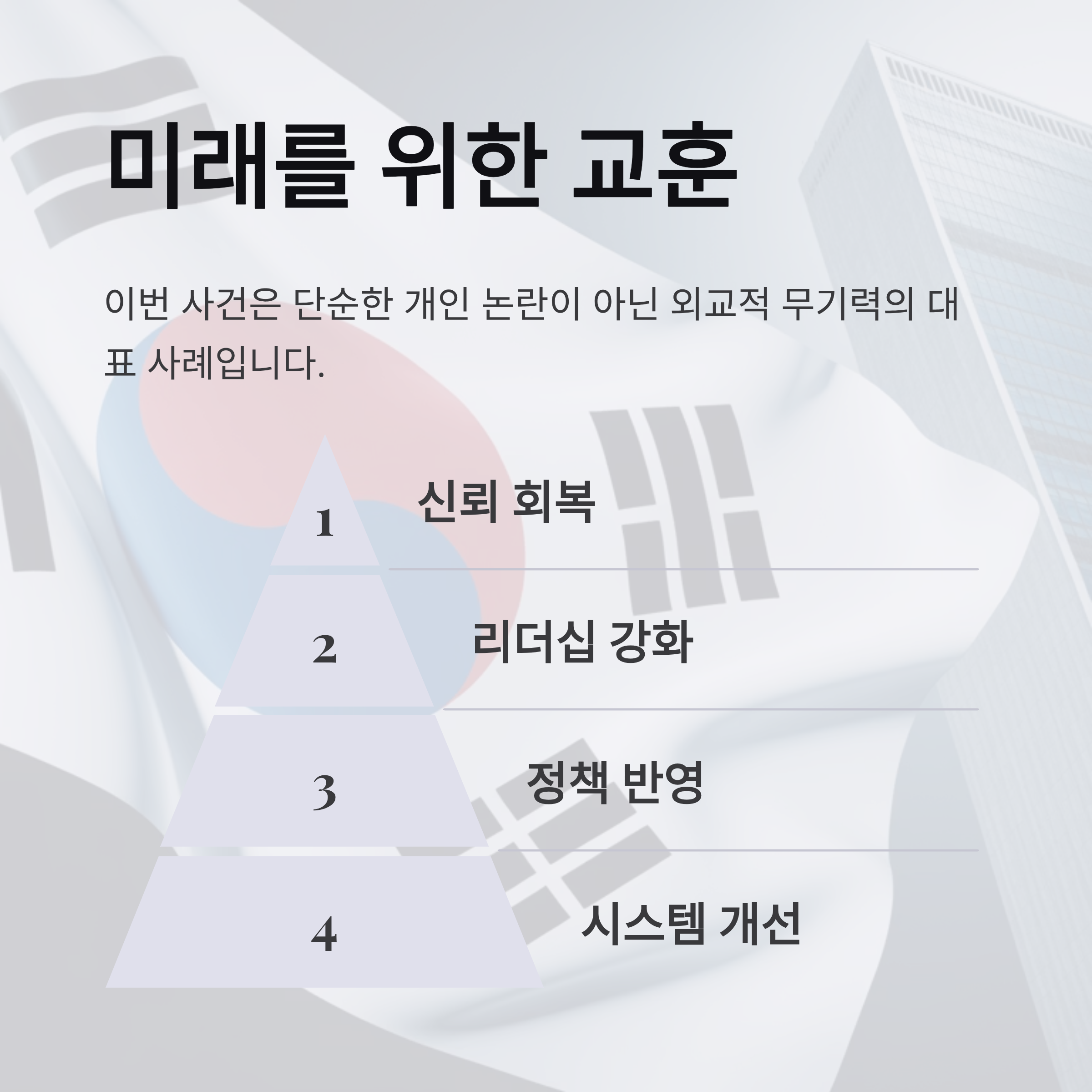 | A. 이번 사건은 외교적 감각 부족을 드러내며, 한국의 국제적 신뢰도에 부정적인 영향을 줄 수 있습니다. 이는 향후 대외정책 전반에 걸쳐 신중함과 개선이 요구된다는 점을 시사합니다. |