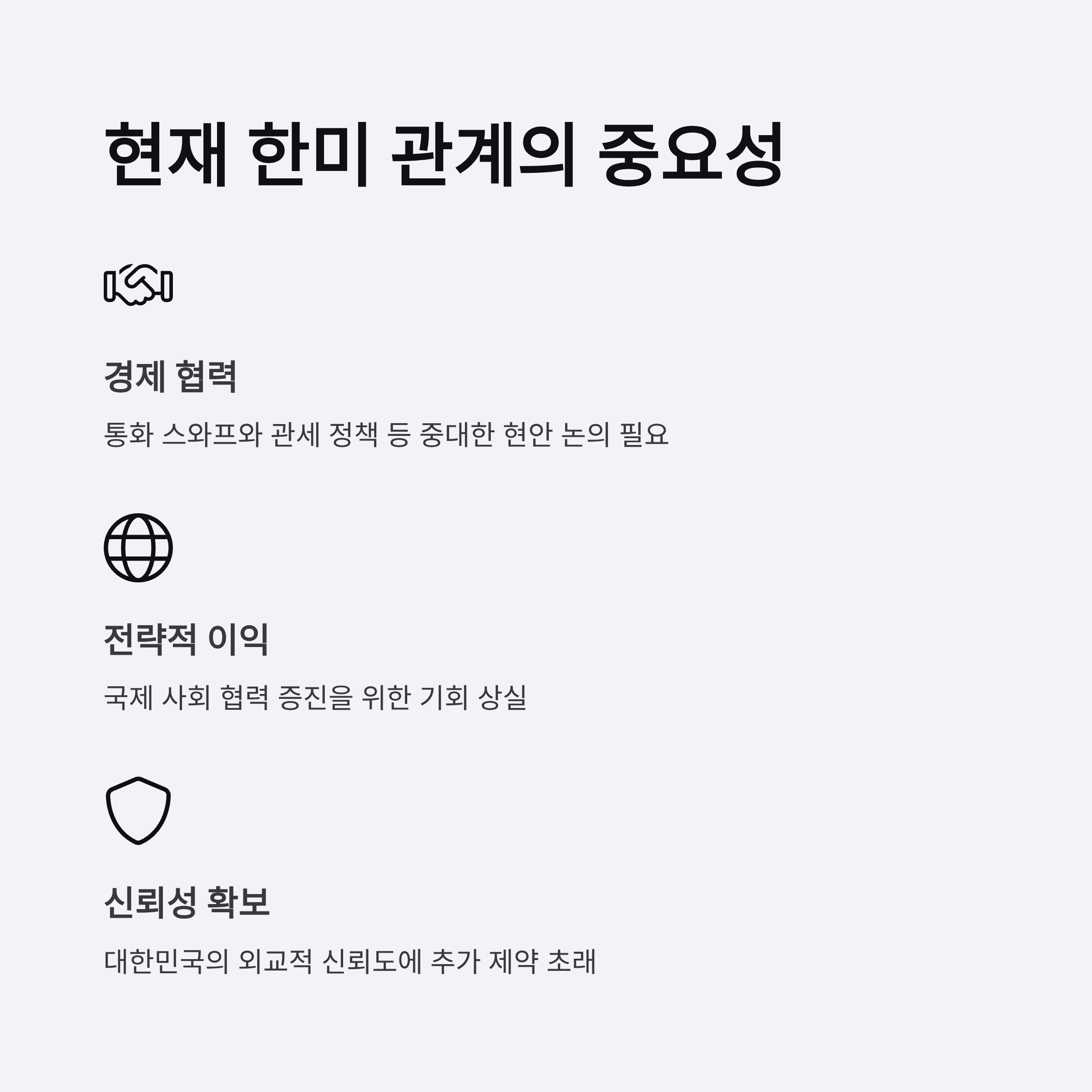 현재 한미 관계는 경제협력을 포함한 여러 외교적 도전 과제를 앞두고 있습니다. 특히 통화 스와프, 관세 정책과 같은 중대한 사안이 논의되는 가운데, 이번 불참은 국제 사회와의 협력 증진을 위한 절호의 기회를 놓쳤다는 평가가 나옵니다. 이는 단지 개인의 선택을 넘어, 대한민국의 전략적 이익 추구와 신뢰성 확보에 있어 추가적인 제약을 초래할 가능성을 시사합니다.