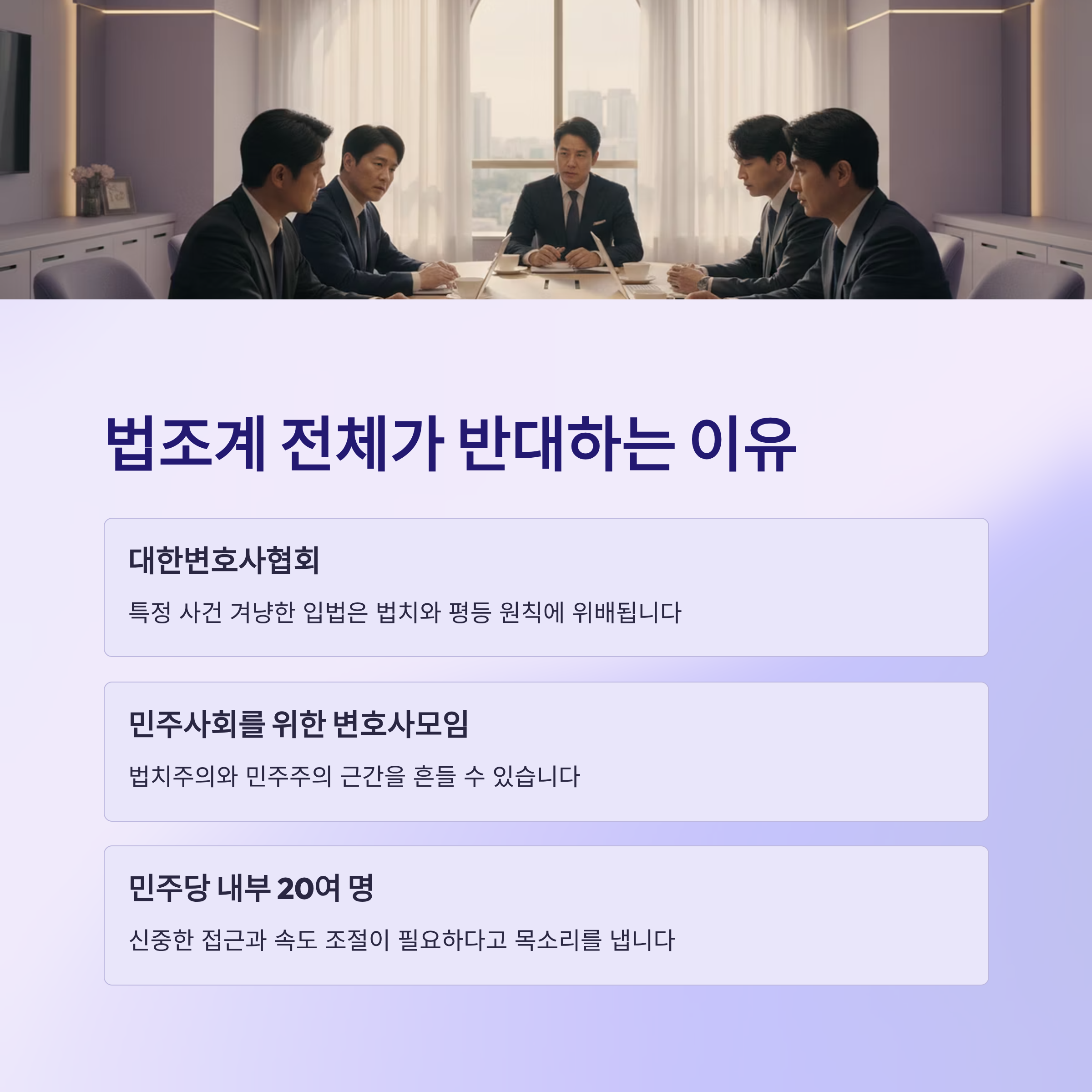 대한변호사협회가 "특정 사건 및 개인을 겨냥한 입법 시도는 사법부의 독립성을 심각하게 위협한다"고 경고한 것도 바로 이 때문입니다.