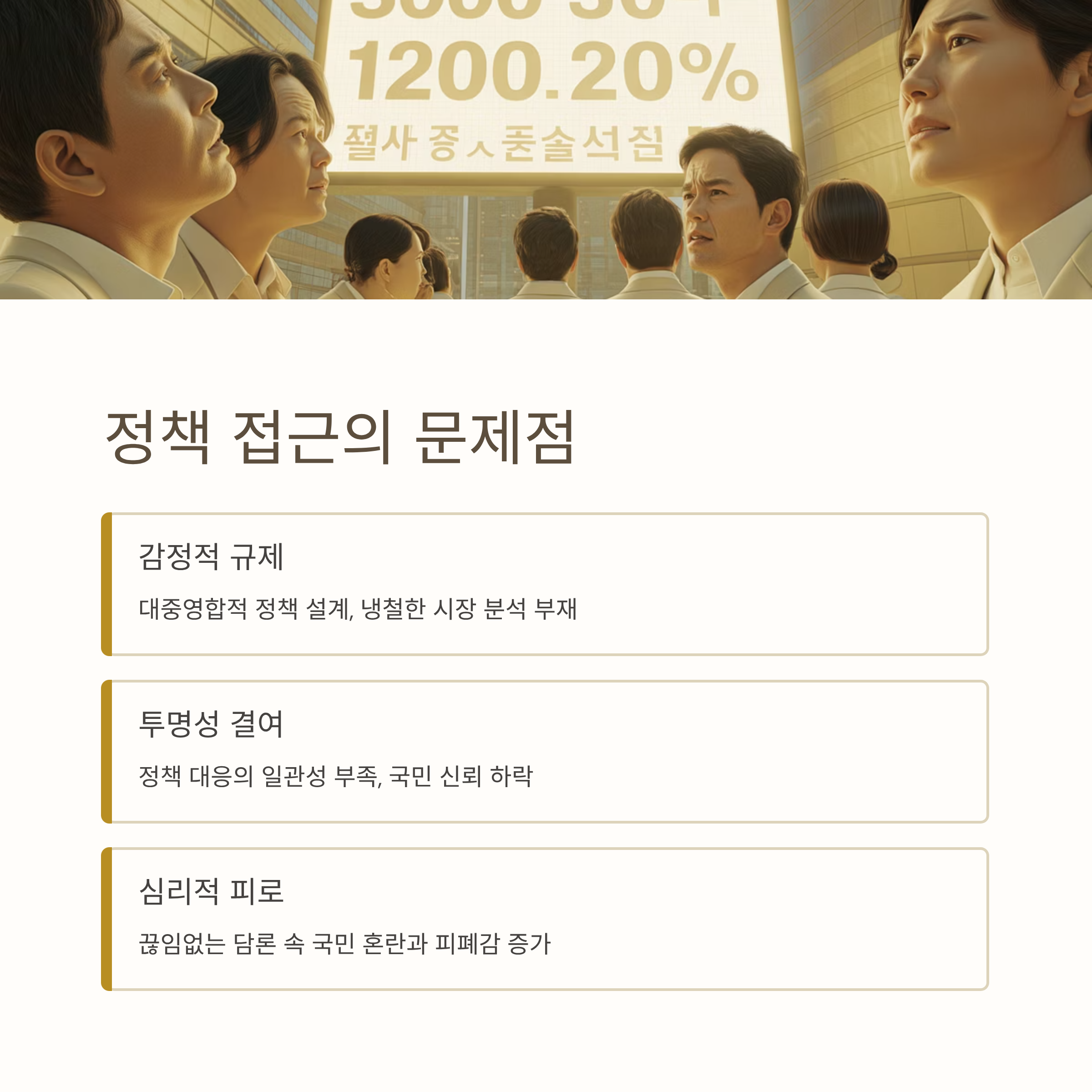 국민이 정부와 정치인의 위선에 피로감을 느끼며 불만을 터뜨리는 이유는 정책 대응의 일관성과 투명성 부족 때문이다. 특히 규제는 지나치게 감정적이고 대중영합적으로 이루어지고 있으며, 냉철한 시장 분석보다는 인기몰이에 초점을 맞추는 경우가 많다. 이러한 접근은 근본적 문제 해결이 아닌, 국민을 심리적으로 피폐하게 만드는 결과를 낳는다.