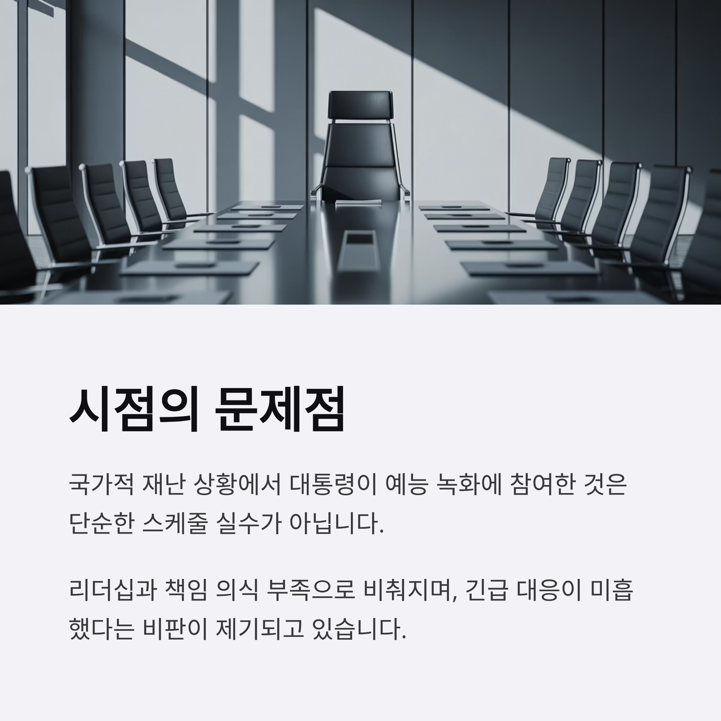 국가적 재난 상황에서 대통령이 예능 프로그램 제작에 참여했다는 사실은 단순히 스케줄 관리 실패로 보기 어렵습니다. 이는 재난 대처에 대한 리더십과 국민에 대한 책임 의식 부족으로 비춰질 수 있습니다. 예능 시장에서 이와 같은 일정 설정 자체가 특정 이미지를 강화하려는 목적이라는 지적이 나오고 있습니다. 특히, 주요 상황 자료를 통한 확인 결과, 사고 당일 긴급 회의는 물론 필요한 현장 대응이 미흡했던 점도 비판의 대상으로 떠올랐습니다.