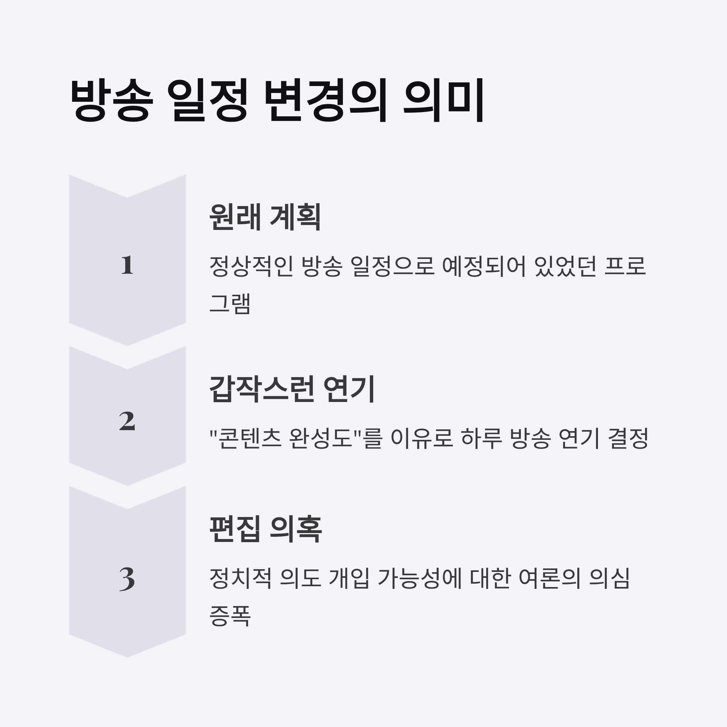 JTBC 측이 방송 일정을 하루 연기한 것을 두고 의견이 갈리고 있습니다. 방송국의 해명은 "콘텐츠 완성도를 높이기 위함"이라는 입장이지만, 이를 편집 작업을 통한 정치적 의도 개입 가능성으로 해석하는 여론이 거세지고 있습니다. 주요 관심사는 편집 과정에서 특정 인물을 중심으로 긍정적인 이미지 연출이 강화되었는지 여부입니다. 이를 확인하기 위해 상식적으로 접근 가능한 디지털 분석 데이터 검토도 요구되고 있습니다.