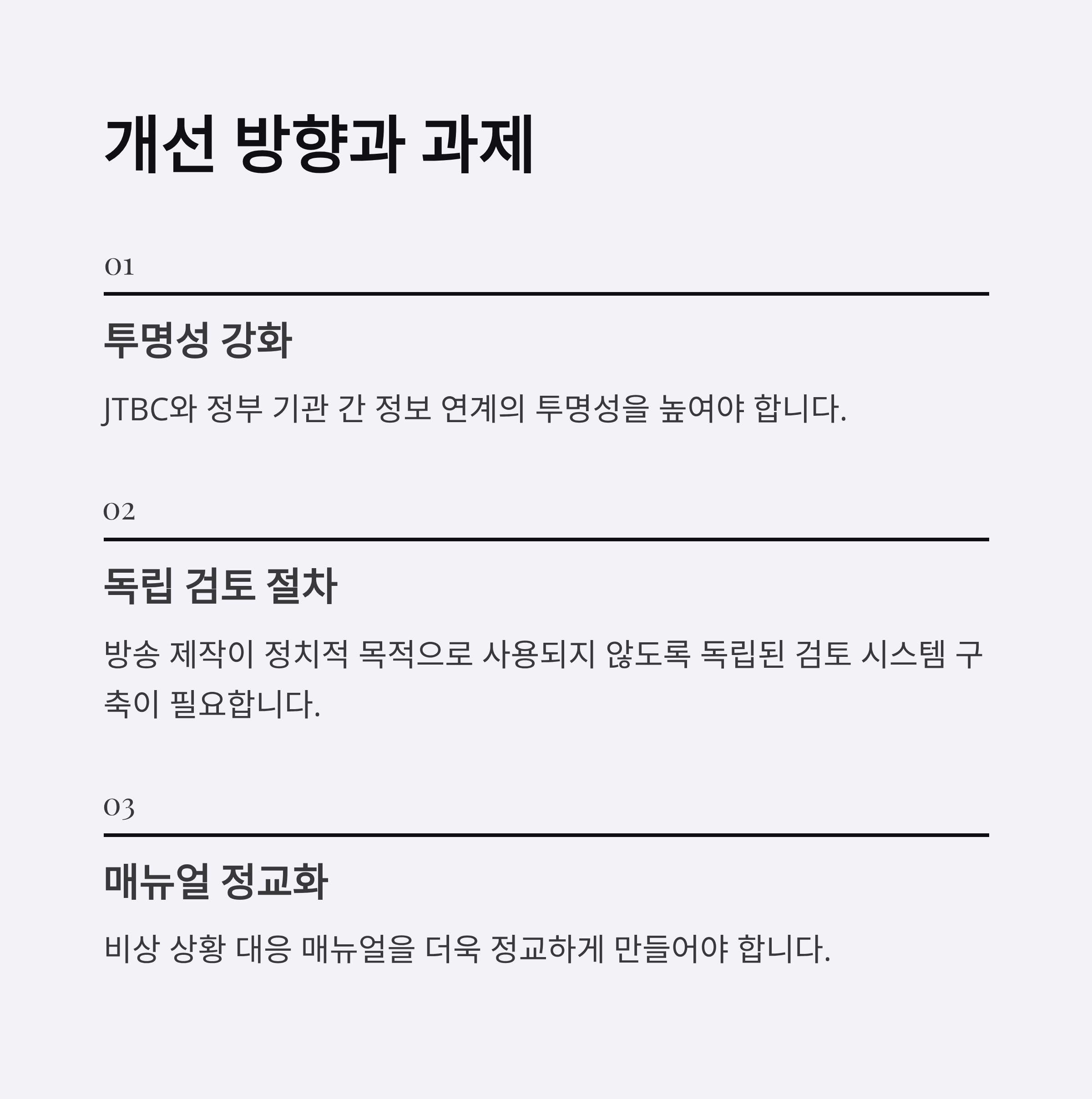 이번 논란의 중심에는 자연재해 상황 속 공직자의 책임과 미디어의 역할에 대한 논의가 자리하고 있습니다. 우선, JTBC와 정부 기관 간의 정보 연계 투명성을 높이는 것이 시급하며, 방송 제작 환경이 정치적 목적으로 사용되지 않도록 독립된 검토 절차를 마련해야 합니다. 또한 정부는 국민의 신뢰를 회복하기 위해 비상 상황 대응 매뉴얼을 더욱 정교화하고, 미디어와의 협력 과정에서 가시성을 높여야 합니다. 향후 반복적인 논란을 막기 위해선 공공기관과 언론사 간의 협약 조항을 재검토하고, 정치적 요소가 아닌 공익성을 우선하는 방향으로 제도적 보완이 이루어져야 할 것입니다.