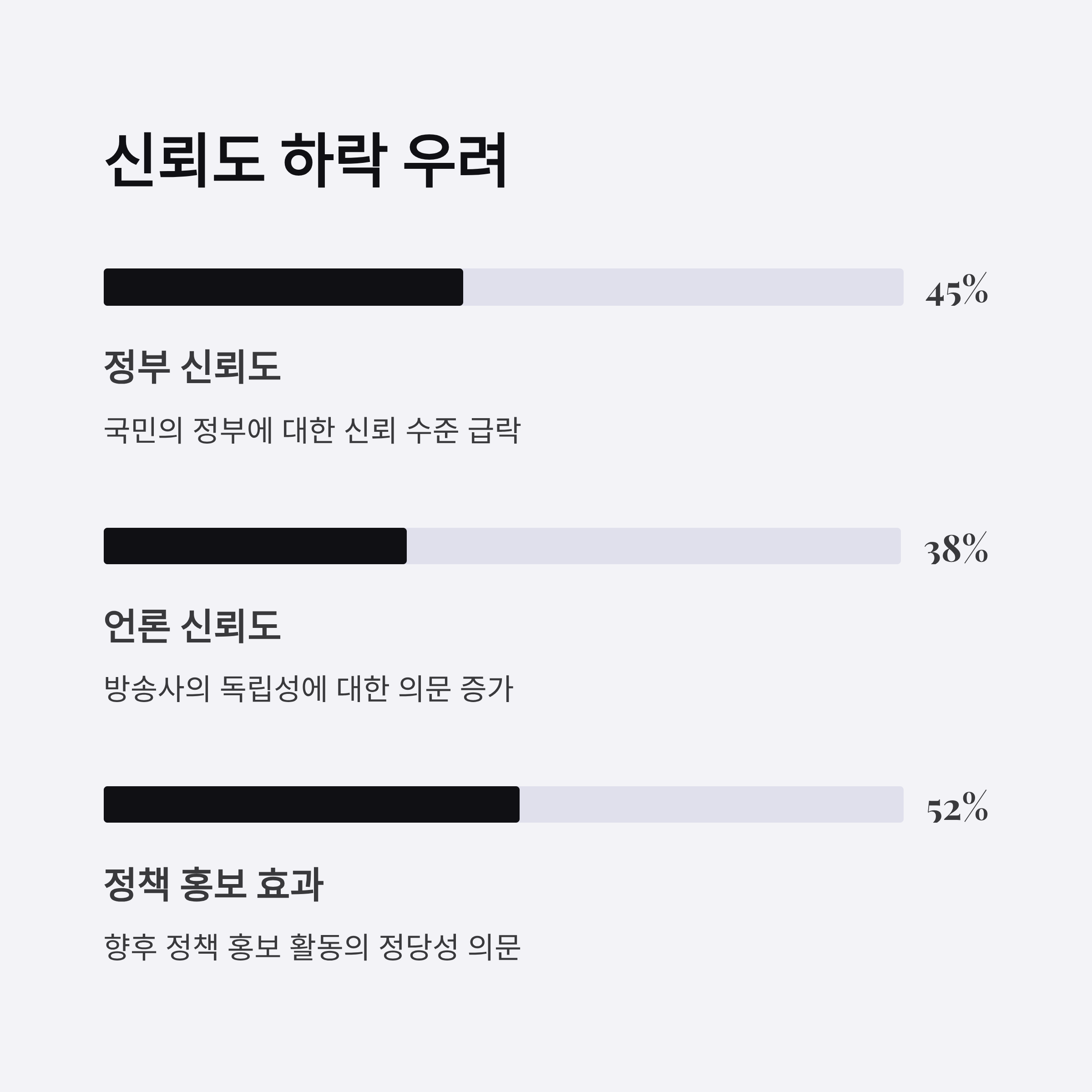 | A. 국민 신뢰도 하락으로 인해 정부와 언론의 이미지가 모두 타격받을 가능성이 큽니다. 또한 정책 홍보 활동의 정당성에도 의문이 제기될 것입니다. |