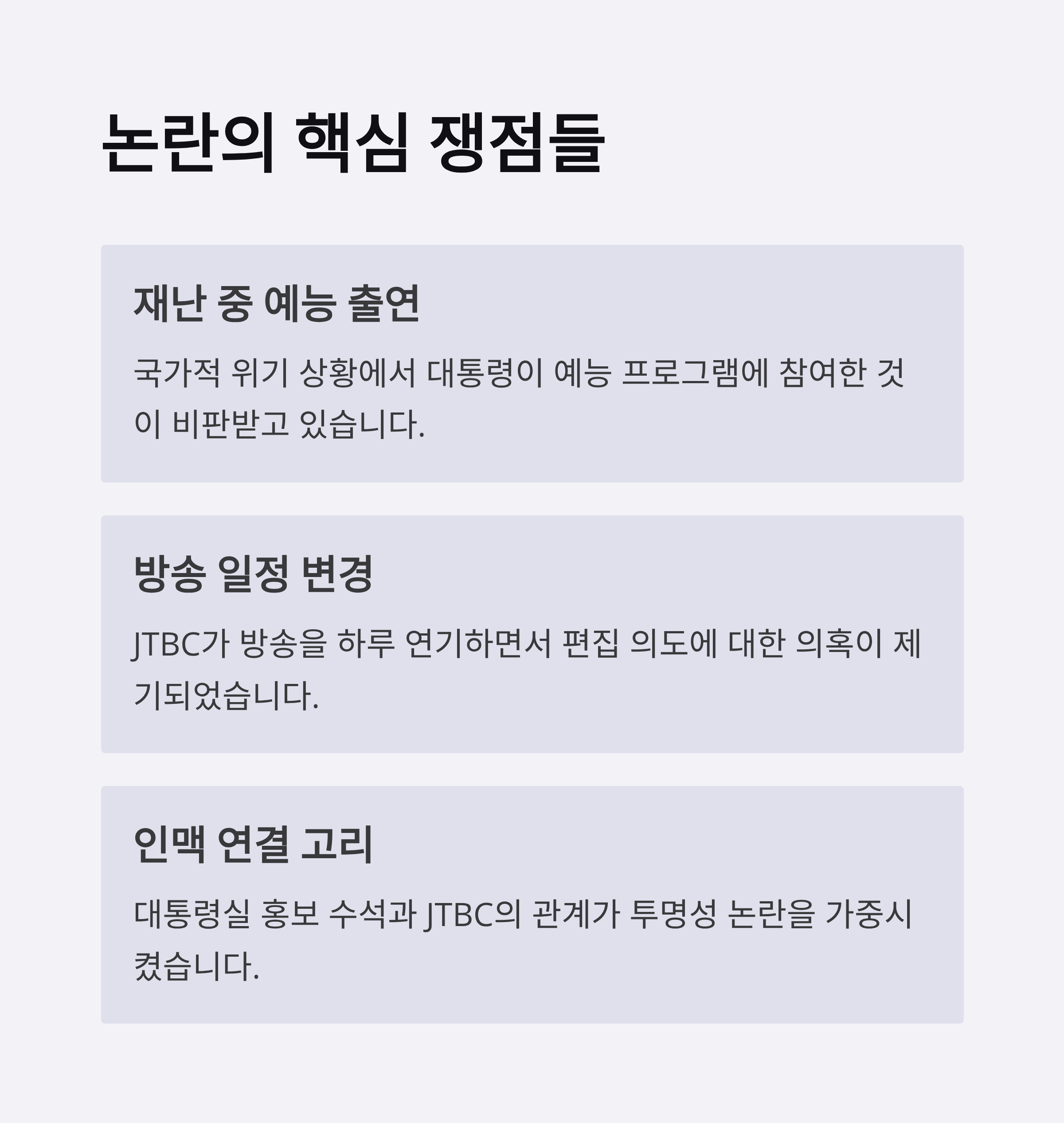 최근 JTBC에서 방영 중인 예능 프로그램을 둘러싸고 뜨거운 논란이 일고 있습니다. 중요한 국가적 재난 상황에서 대통령실과 방송사의 협력 구조가 문제가 되었는데요. 특히 방송 일정이 하루 연기됨으로써 세간의 의혹은 증폭되고 있으며, 대통령실 홍보 수석의 과거 경력이 이 이슈 중심으로 제기되었습니다. 이는 과연 단순한 방송 제작상의 결정인지, 혹은 정치적 배후의 움직임인지 관심이 집중되고 있습니다. 본 글에서 이 논란의 배경과 주요 쟁점들을 상세히 살펴보고자 합니다.
