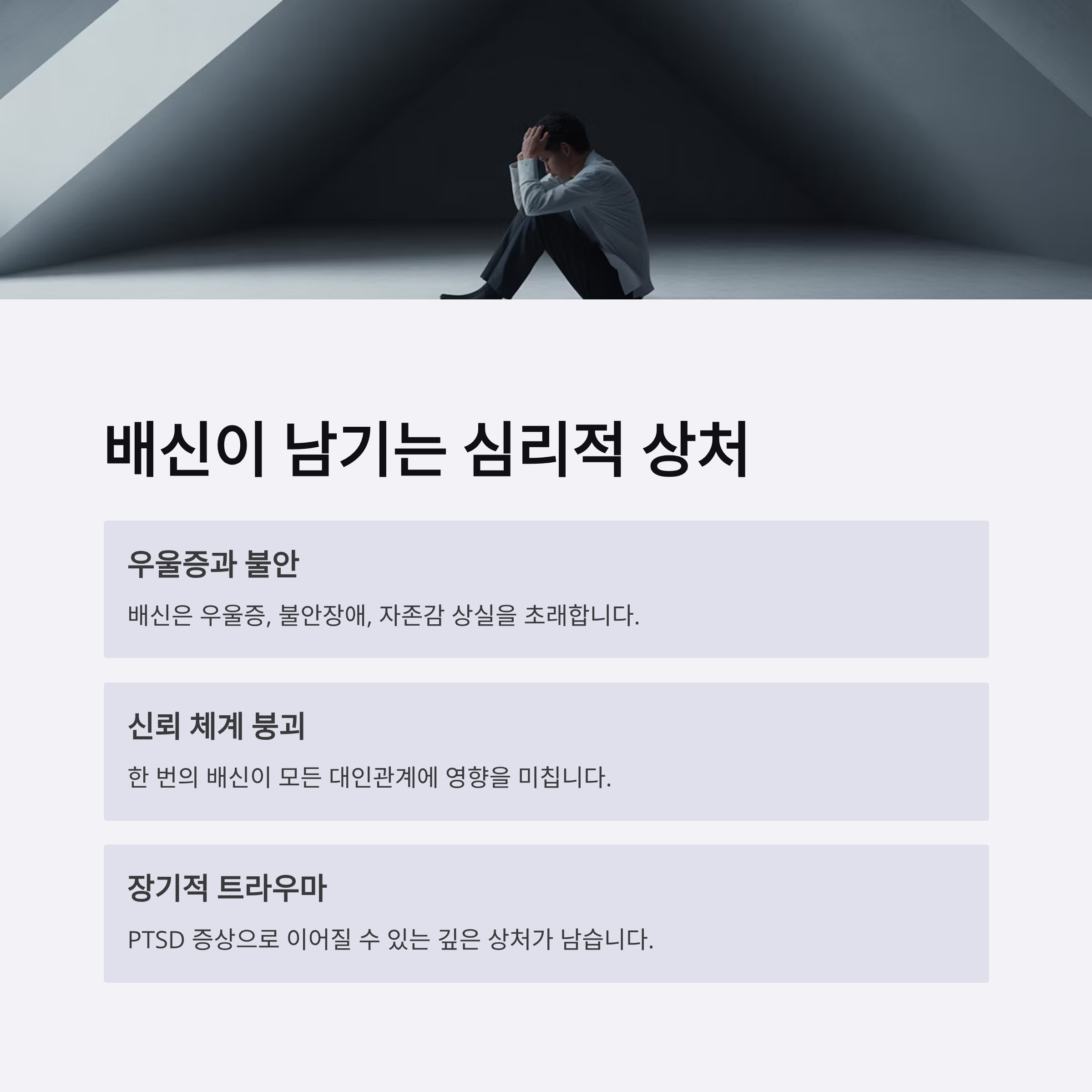 배신은 인간 심리에 깊은 상처를 남기며, 종종 그 영향은 사람의 모든 대인관계에 걸쳐 나타나게 됩니다. 심리학 연구에 따르면, 배신은 우리의 신뢰 체계를 무너뜨리고 그것이 다시 회복되기까지는 많은 시간이 필요합니다. 실제로 배신당한 경험을 한 사람들은 우울증, 불안 장애, 그리고 자기 존중감의 상실을 겪는 경우가 많습니다. 이는 단지 한 사람과의 관계를 넘어서 스스로와의 관계에도 부정적 영향을 주게 됩니다.