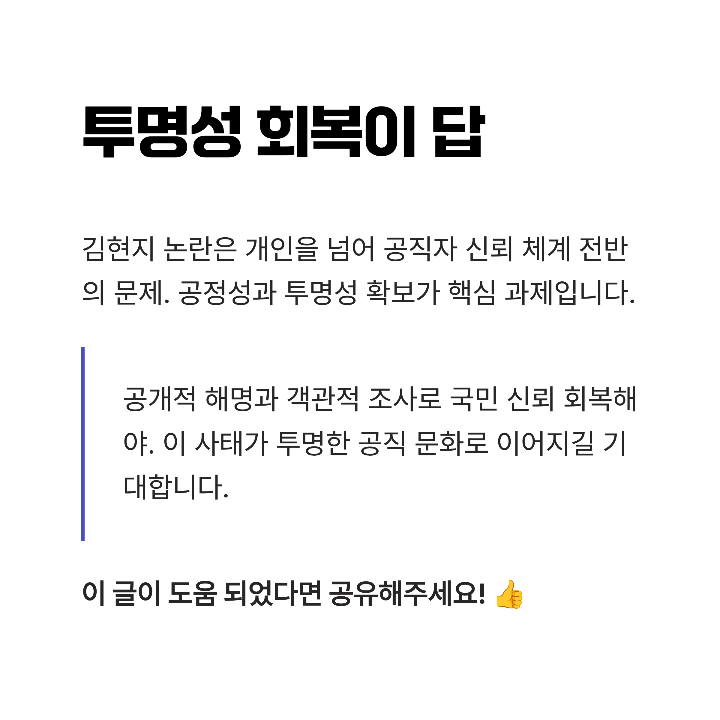김현지 논란은 단순히 개인의 문제를 넘어 공직자 투명성, 신뢰성, 정치적 책임에 대한 사회적 담론을 촉발시키는 사건으로 여겨지고 있습니다. 주요 의혹들은 개인적인 정보의 차원을 넘어서 국가 정책과 공직자 신뢰 체계 전반적인 문제를 드러냅니다. 이 논란의 핵심은 단지 비공개 정보를 밝히는 데 있지 않습니다. 공정성과 투명성을 확보하고, 국민 신뢰를 회복하는 것이 더 중요한 문제입니다. 이를 위해 정부는 공개적인 해명과 객관적인 조사 과정을 보여줘야 할 것입니다. 김현지 사태가 투명하고 공정한 공직 문화로 이어지는 계기가 되길 바라며, 이러한 흐름이 앞으로의 공직 임명 절차에 반영되길 기대합니다.