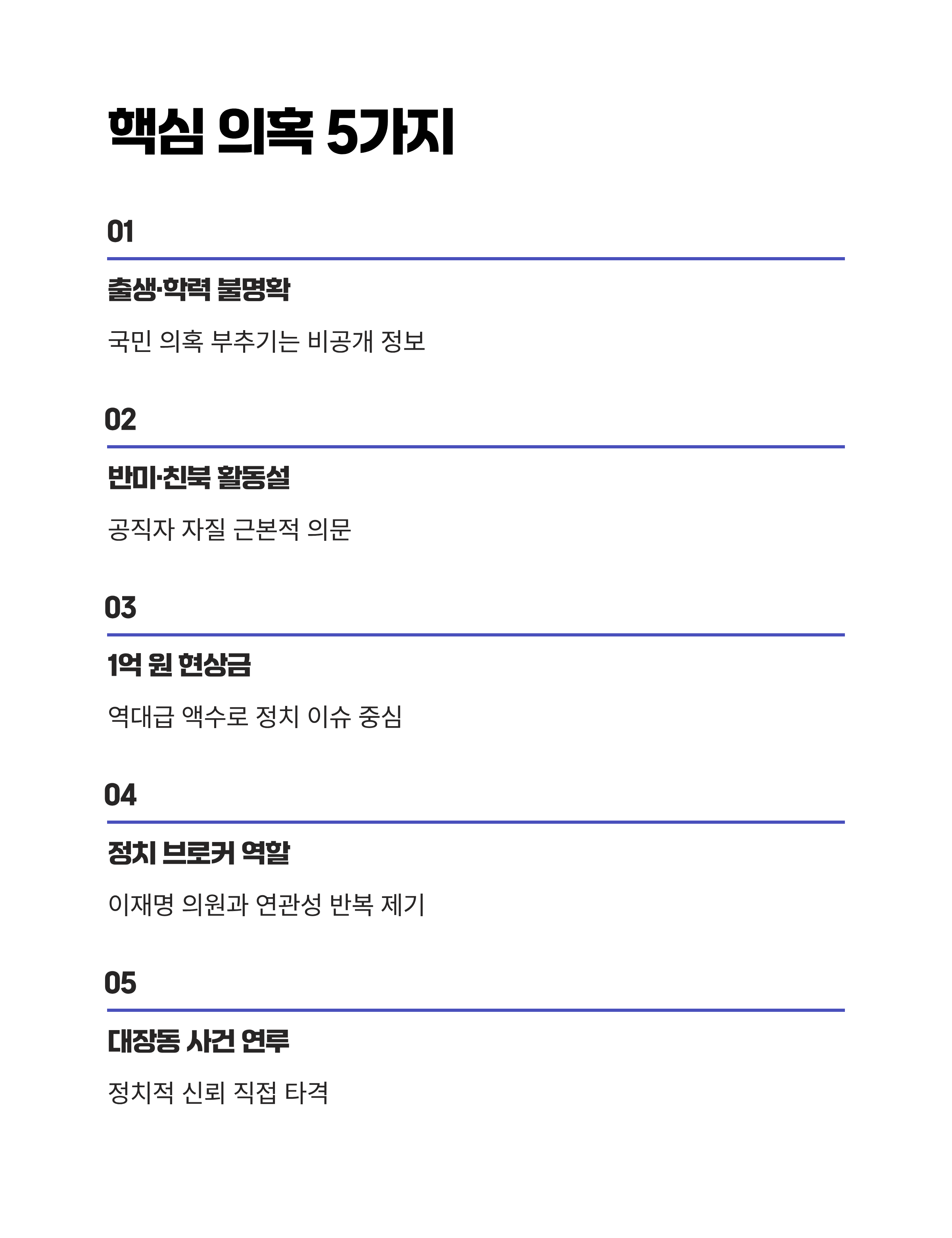 - 대장동 및 기타 주요 사건들과의 연루 주장이 그녀의 정치적 신뢰에 직접적인 타격을 주고 있으며 공분을 일으키고 있습니다.