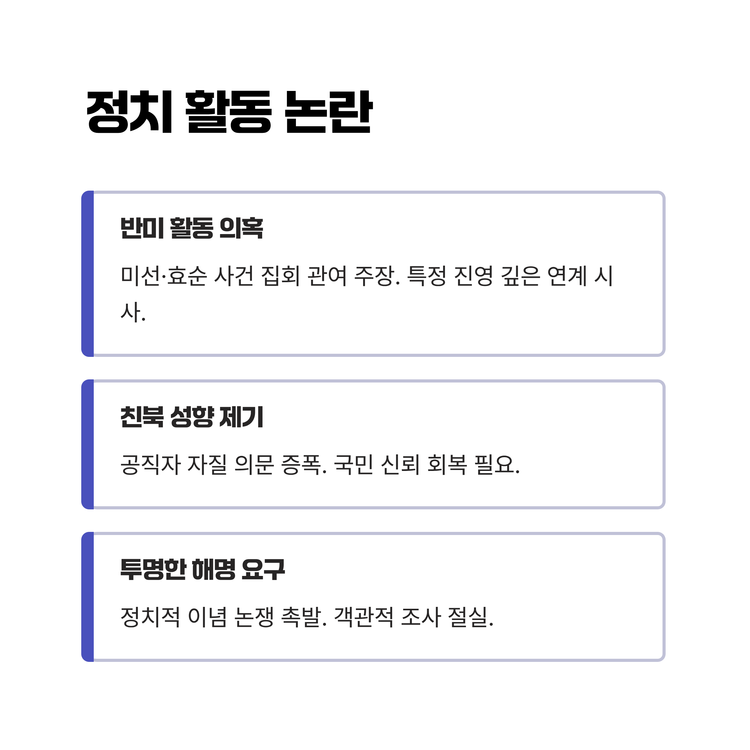 - 수많은 정치적 논란 속, 그녀의 반미 및 친북 활동설이 공직자로서의 자질에 의문을 더합니다.