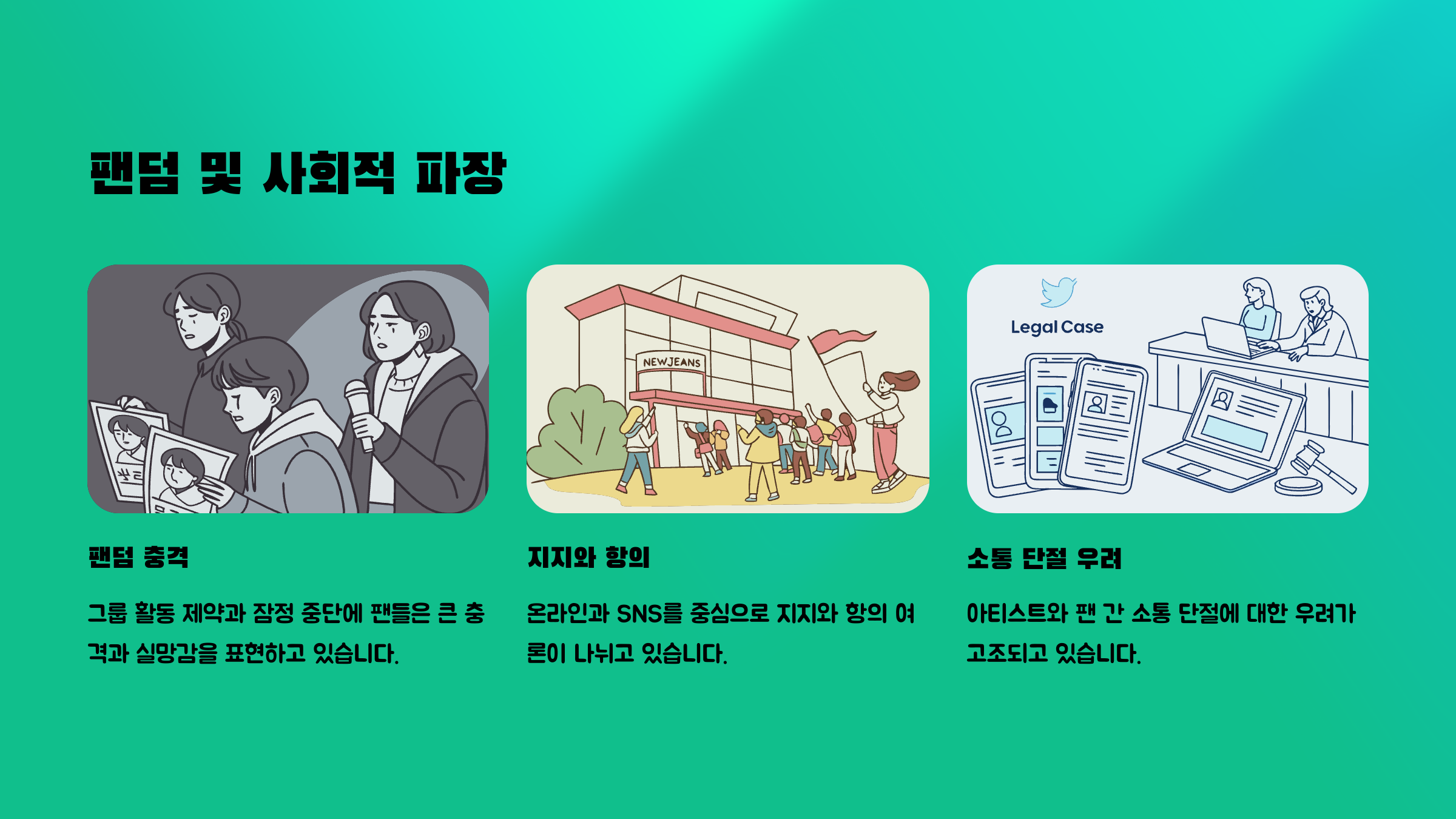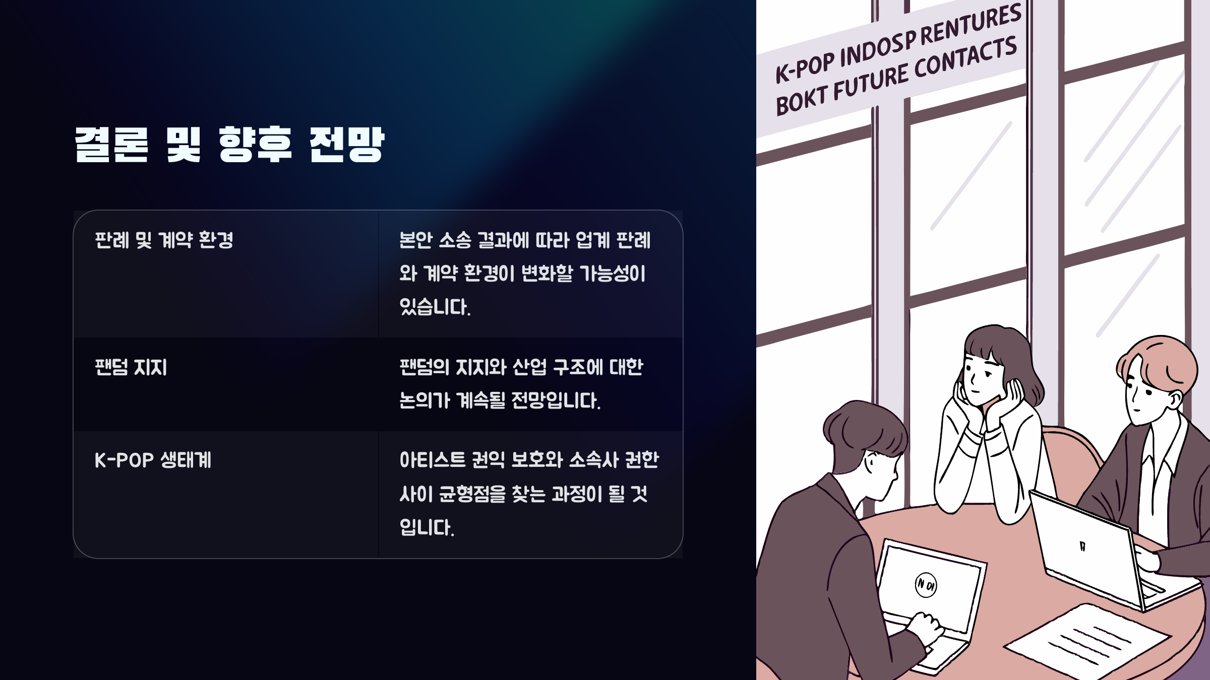 이번 사건은 단순한 뉴진스 한 그룹의 문제가 아닙니다. SM, YG, JYP 등 대형 기획사 중심의 K-POP 시스템에서 아티스트의 독립은 늘 갈등의 뇌관이 되어 왔습니다. 뉴진스 사건은 향후 유사 사례에서 법적 해석의 기준으로 활용될 수 있으며, 동시에 아티스트 권리 보호를 위한 제도적 보완의 필요성을 절실하게 만들었습니다. 팬덤 역시 단순한 감정의 영역을 넘어 법적 현실에 눈을 돌리게 된 계기가 되었습니다.
