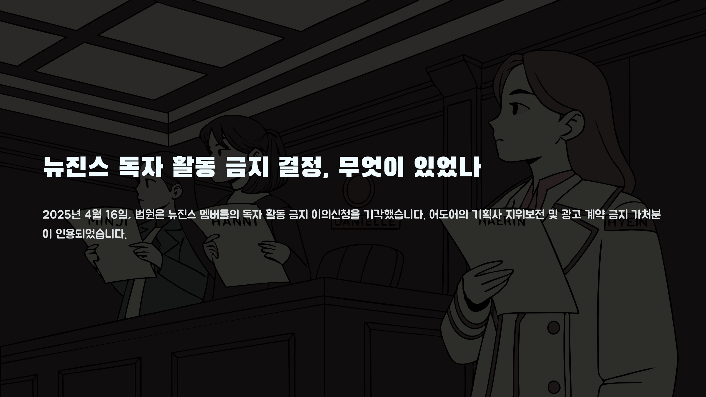 • 2025년 4월 16일, 뉴진스 멤버들의 독자 활동 금지 가처분 이의 신청이 기각되며 독립 활동이 불가하게 됨