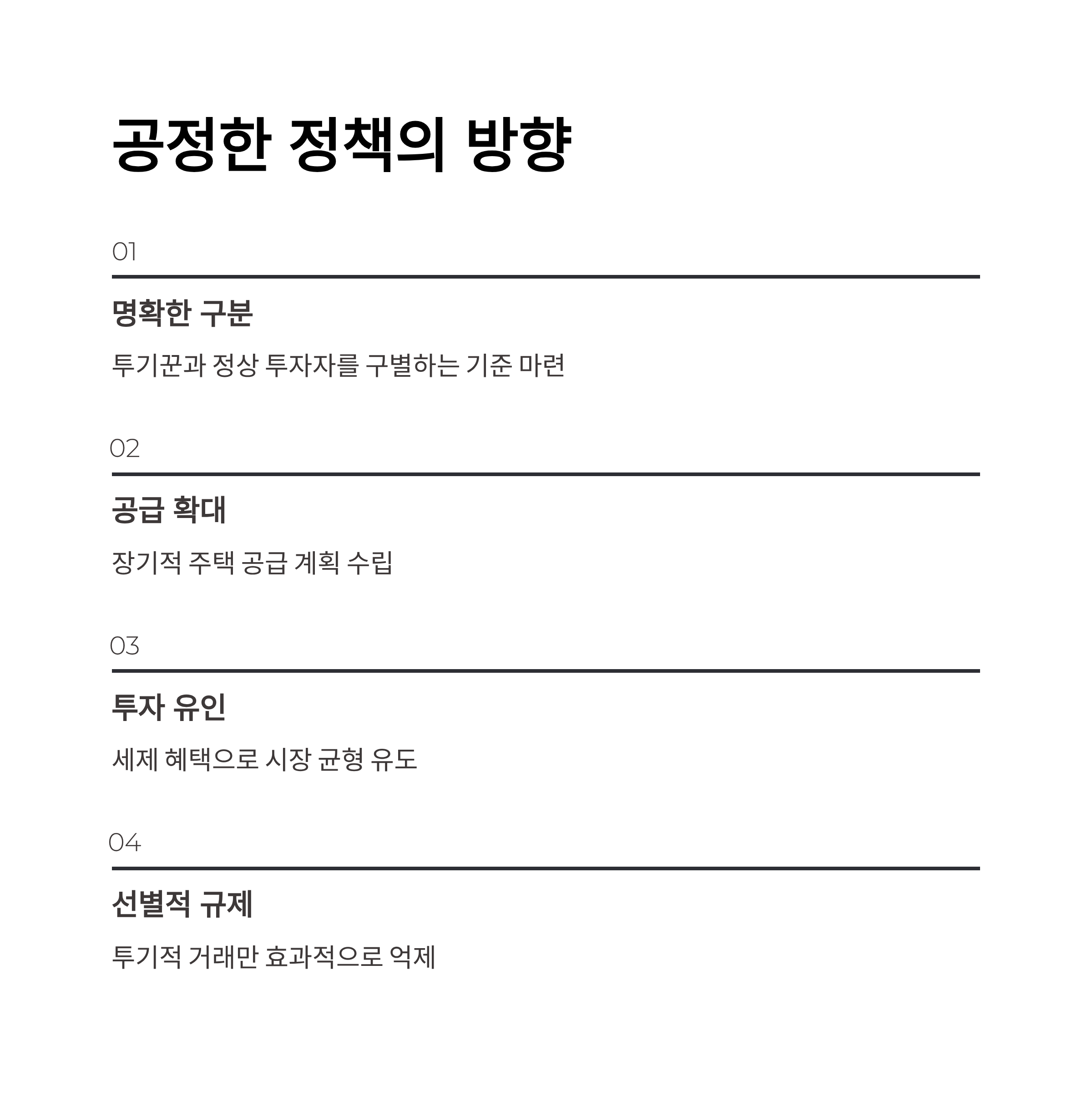 | A. 주택 공급 확대와 장기적 시장 자율성 강화가 핵심 대안입니다. 투기 행위와 정상 투자 활동을 명확히 구분해 정책을 설계해야 합니다. |