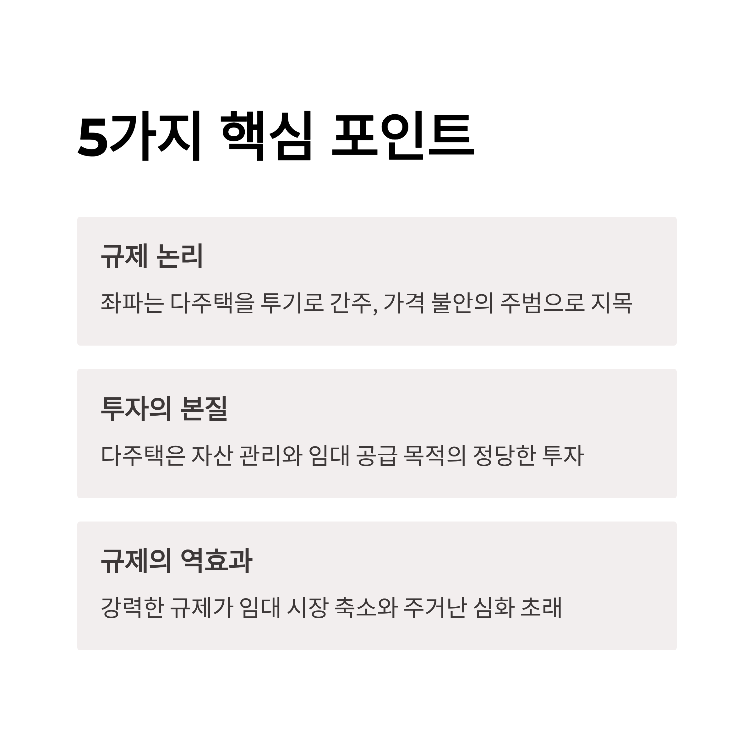 5. 다주택 논란은 이념적 시각이 아닌 경제적 관점에서 접근해야 하며, 현실적인 대안 마련이 시급합니다.