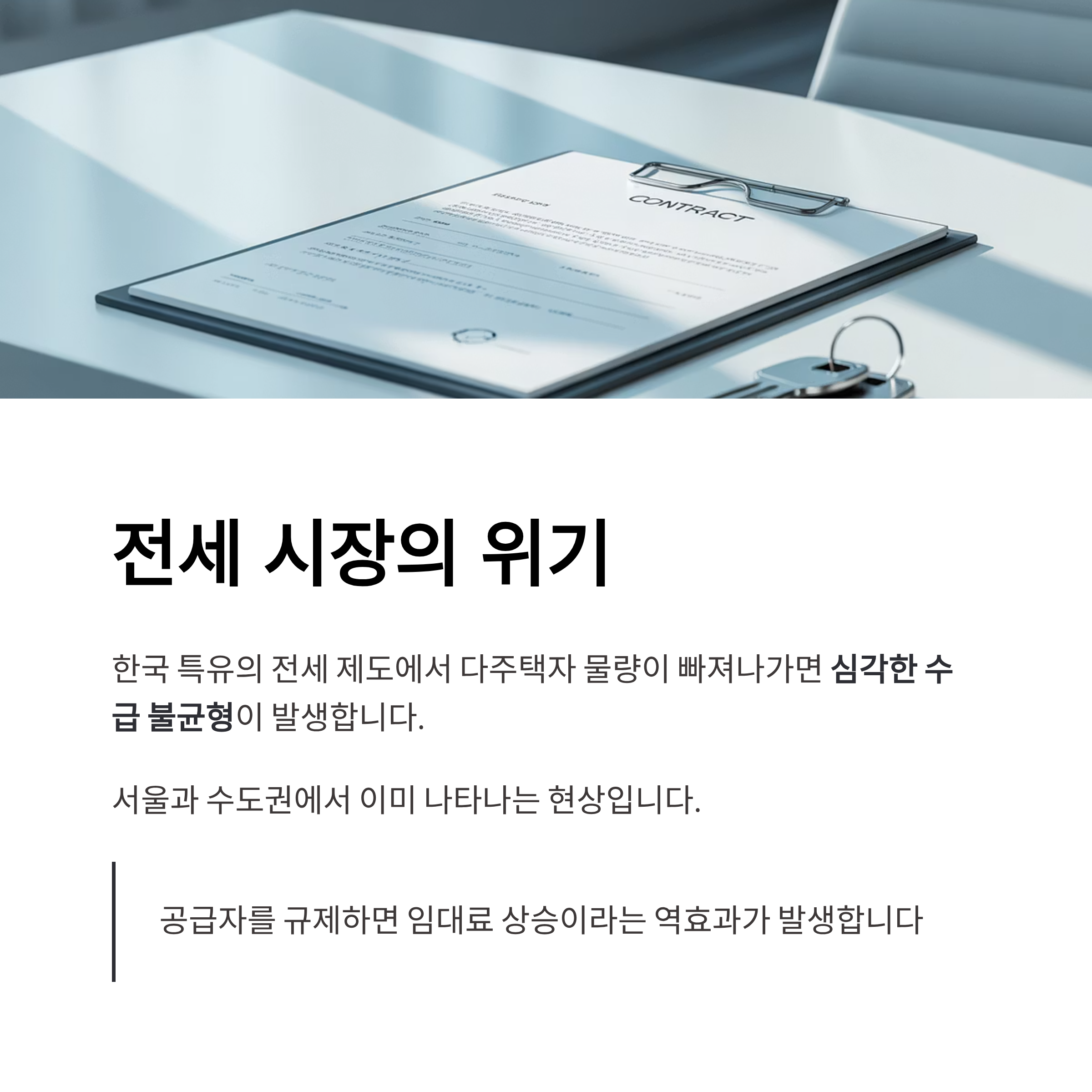 규제를 강화해 다주택자를 줄이고 실수요 중심의 거래로 전환하려는 정부의 시도는 임대 시장에 부작용을 초래할 가능성이 높습니다. 강력한 세금 부과와 실거주 요건 강화는 다주택자들이 매물을 처분하게 만들고, 이는 임대 시장의 공급 감소로 이어질 수 있습니다. 특히 전세 제도가 보편화된 한국 시장에서는 다주택자의 물량이 빠져나갈 경우 임대물건 수급 불균형이 발생할 수 있습니다. 이로 인해 저소득층을 포함한 서민들의 주거 부담이 매년 심화될 위험이 있으며, 이러한 현상은 이미 서울과 수도권에서 나타나고 있습니다. 이처럼 공급자 역할을 하는 다주택자를 규제하는 것이 실제로는 임대료 상승과 같은 역효과를 불러올 수 있다는 점을 주목해야 합니다.