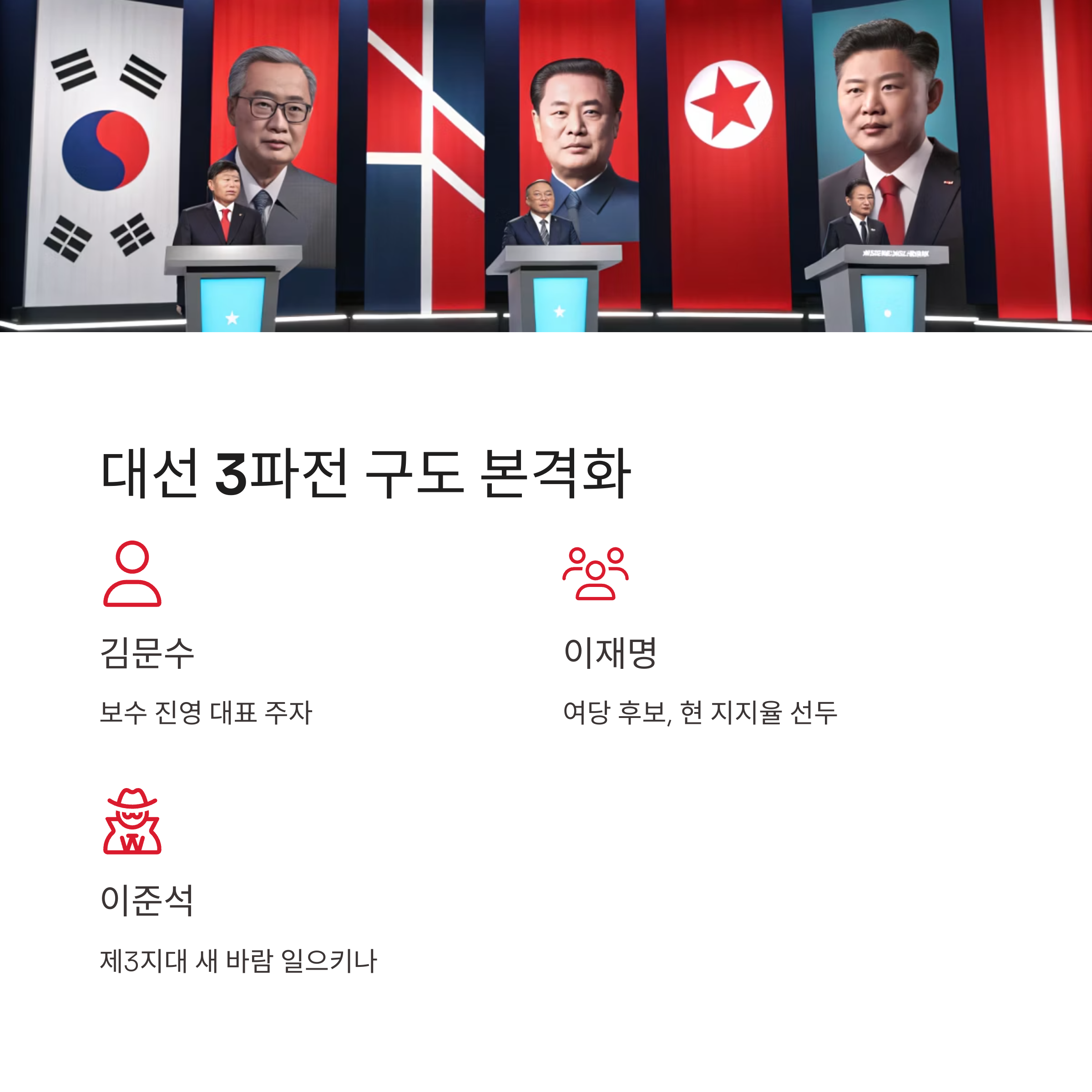 - 대선 구도는 김문수-이재명-이준석 3파전으로 전환되며, 대립 구도 심화.