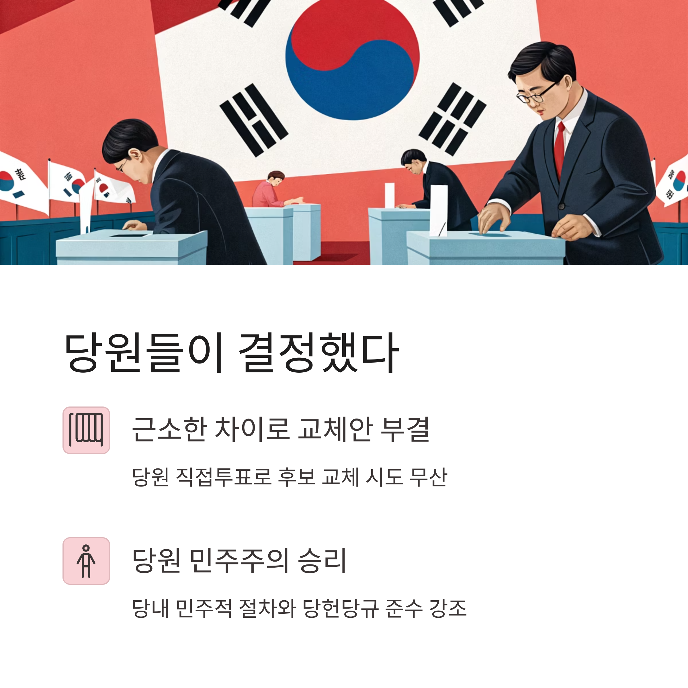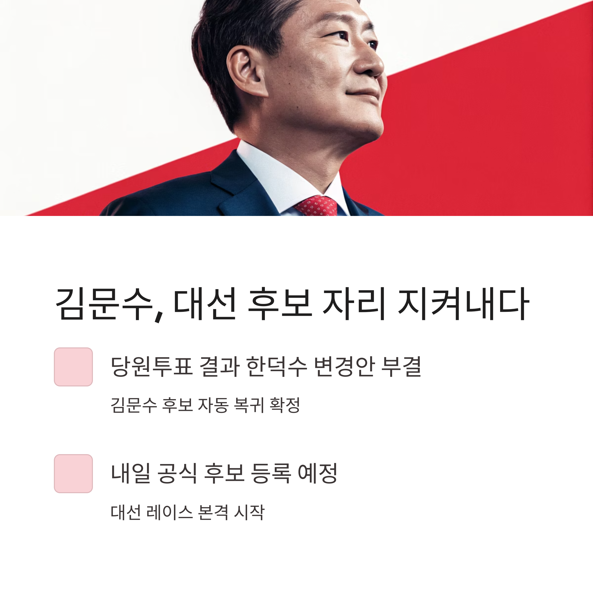 - 당원투표 결과, 한덕수 후보 변경안은 부결되었고 김문수 후보가 자동 복귀.