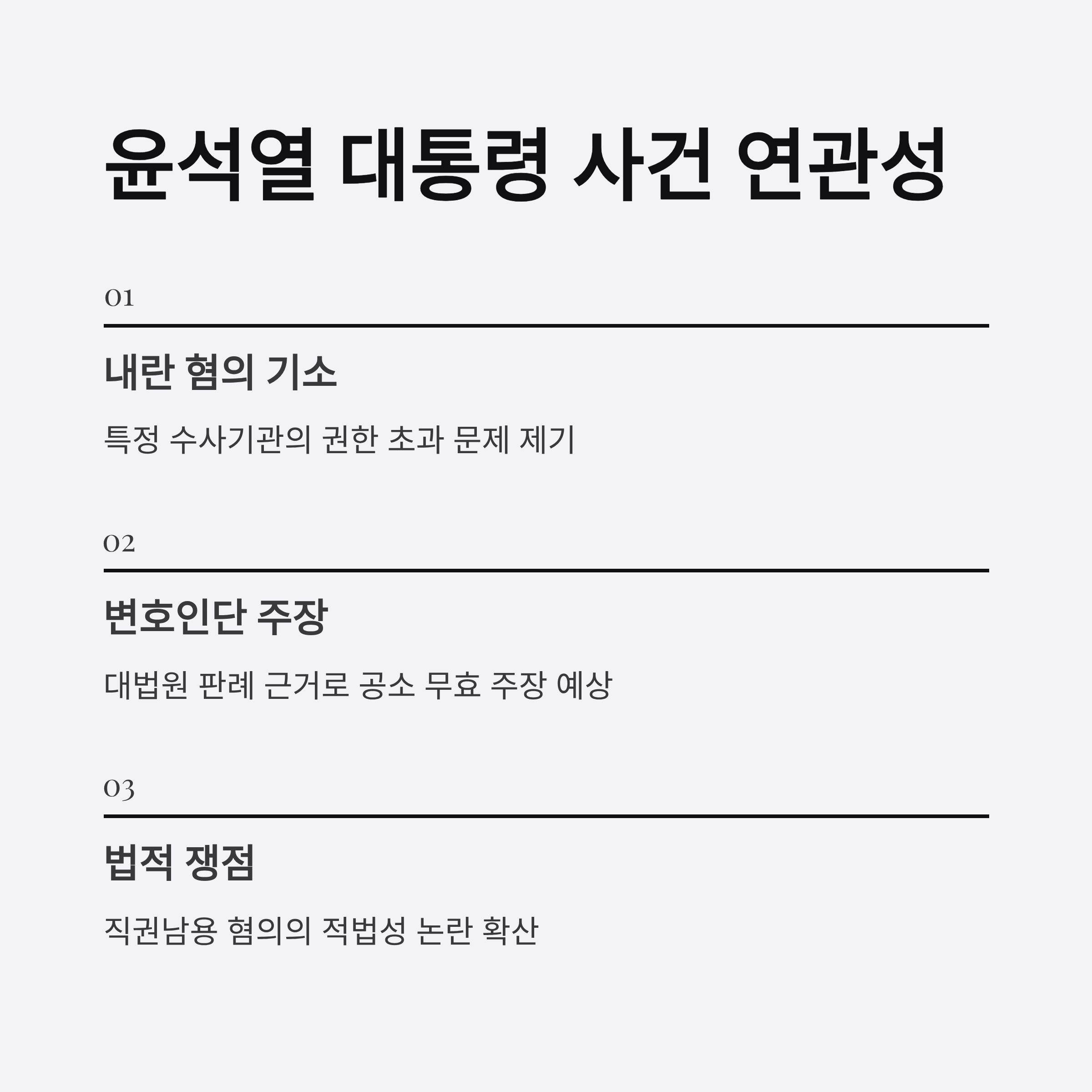 윤석열 대통령 관련 사건에서 이번 판결의 의미는 매우 중요하다. 변호인단은 대법원이 이번 사건에서 세운 새로운 기준점을 들어, 대통령 내란 및 직권남용 혐의 공소가 적법하지 않다고 주장할 가능성이 높다. 실제로 내란 혐의와 관련된 공소는 특정 수사기관의 권한 초과와 법적 절차 위반 문제가 제기된 바 있다.