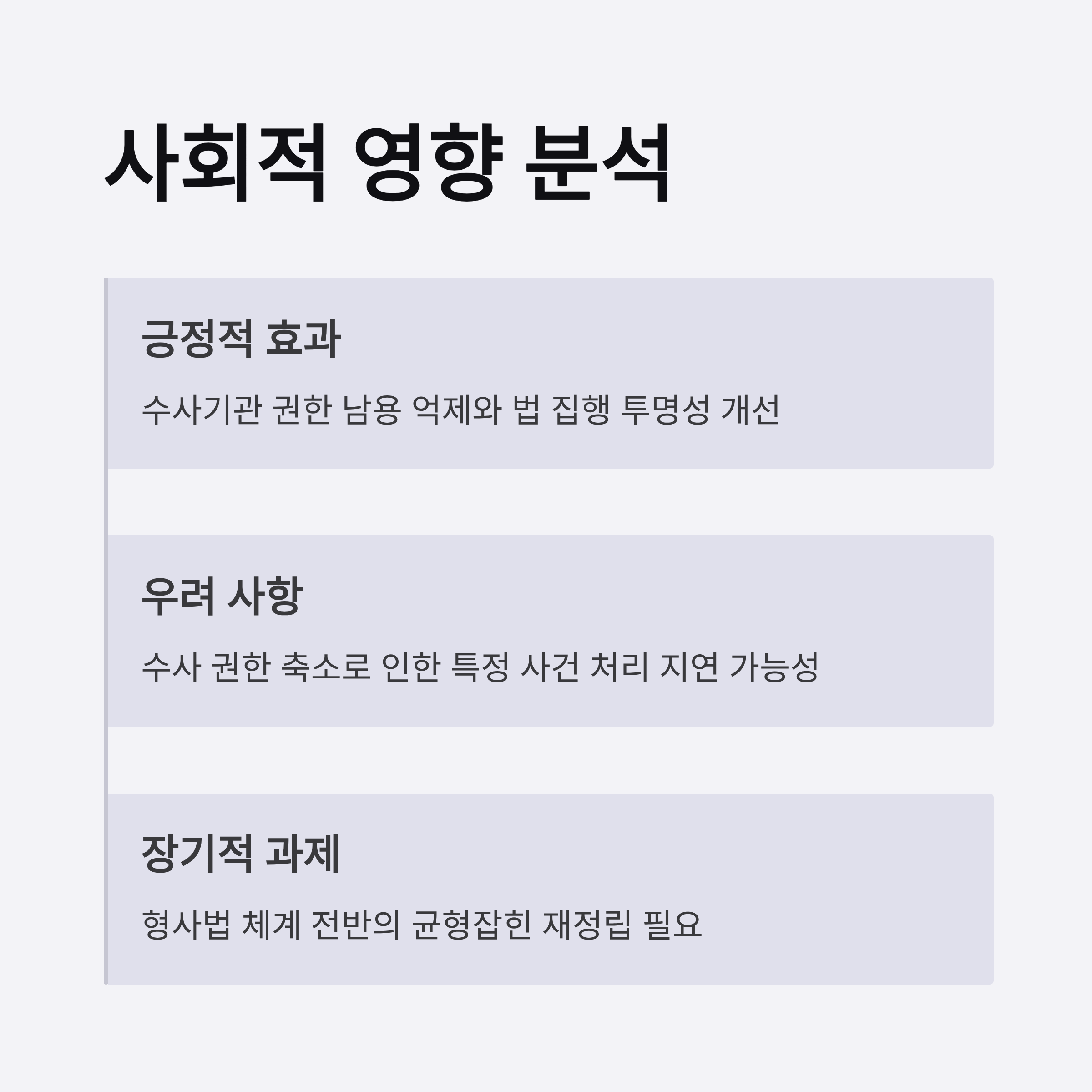 사회적 관점에서는 수사기관의 권한 남용이 억제되고 법 집행 투명성이 개선될 것으로 보인다. 그러나 동시에 수사기관의 권한 축소가 특정한 사건 처리에 어떻게 작용할지는 앞으로도 면밀히 검토돼야 한다.