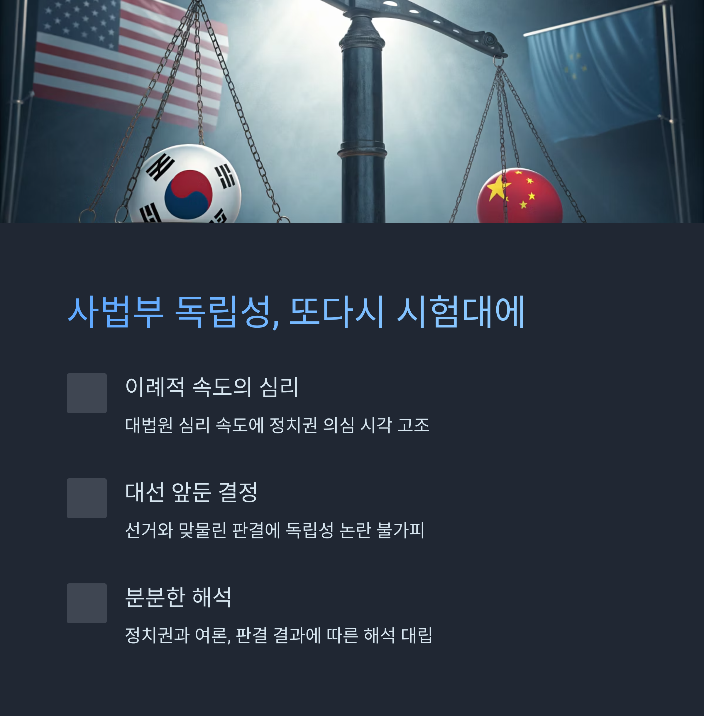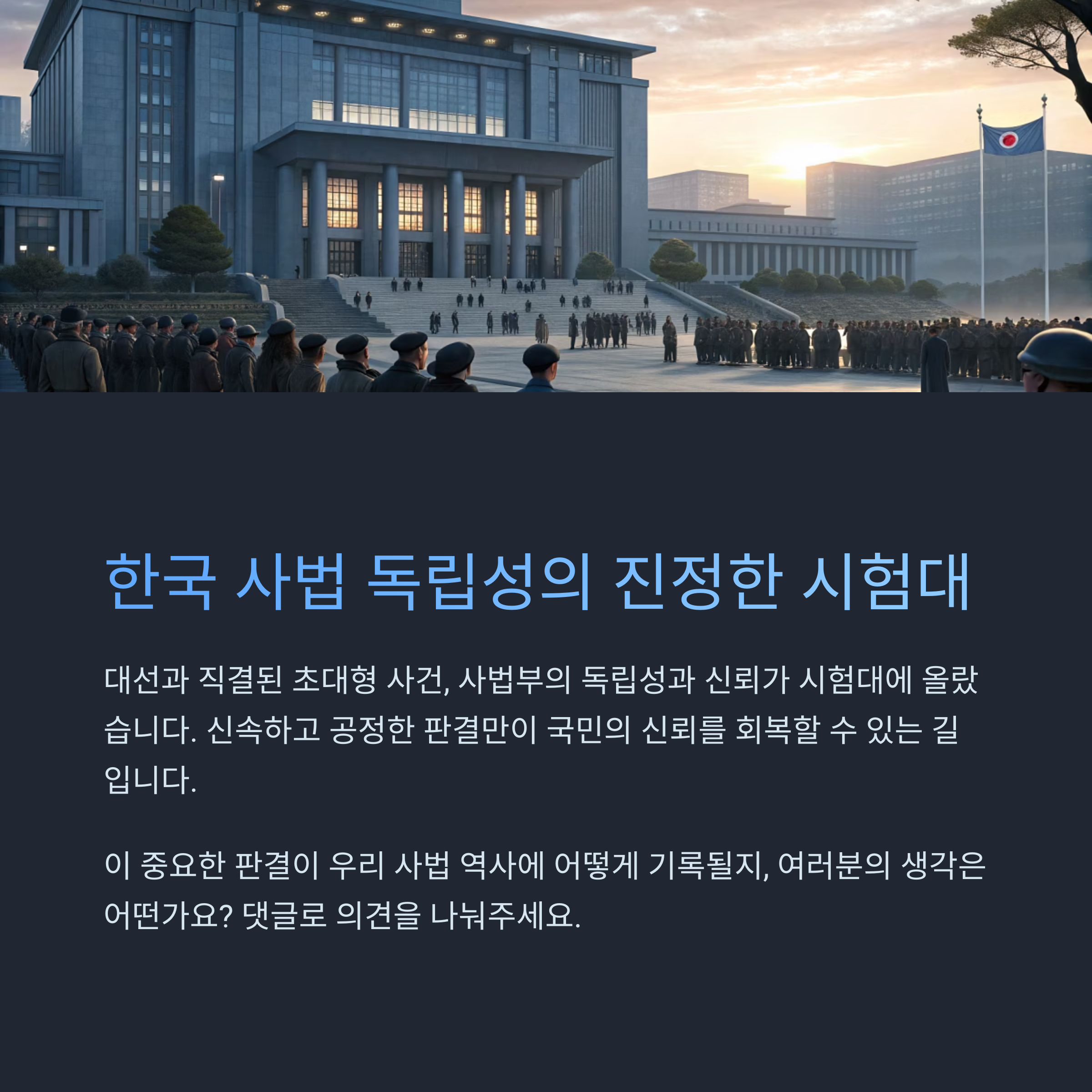 사법부가 원칙과 정의를 따르느냐, 정치적 고려에 휘둘리느냐에 따라 국민 신뢰가 크게 달라질 것입니다. 이번 사건은 사법부의 독립성과 공정성 자체를 가늠하는 리트머스 시험지로 평가받고 있습니다.