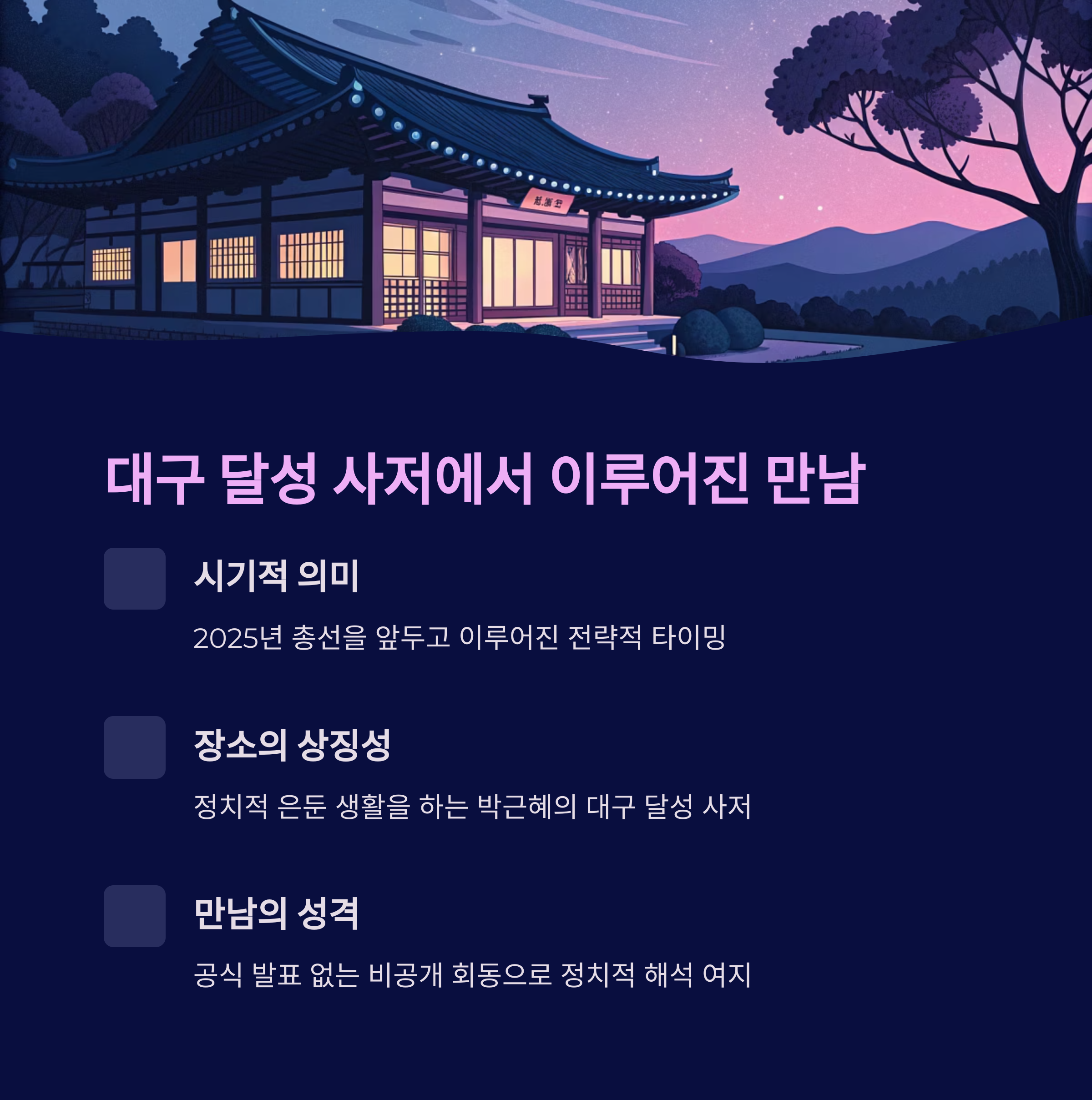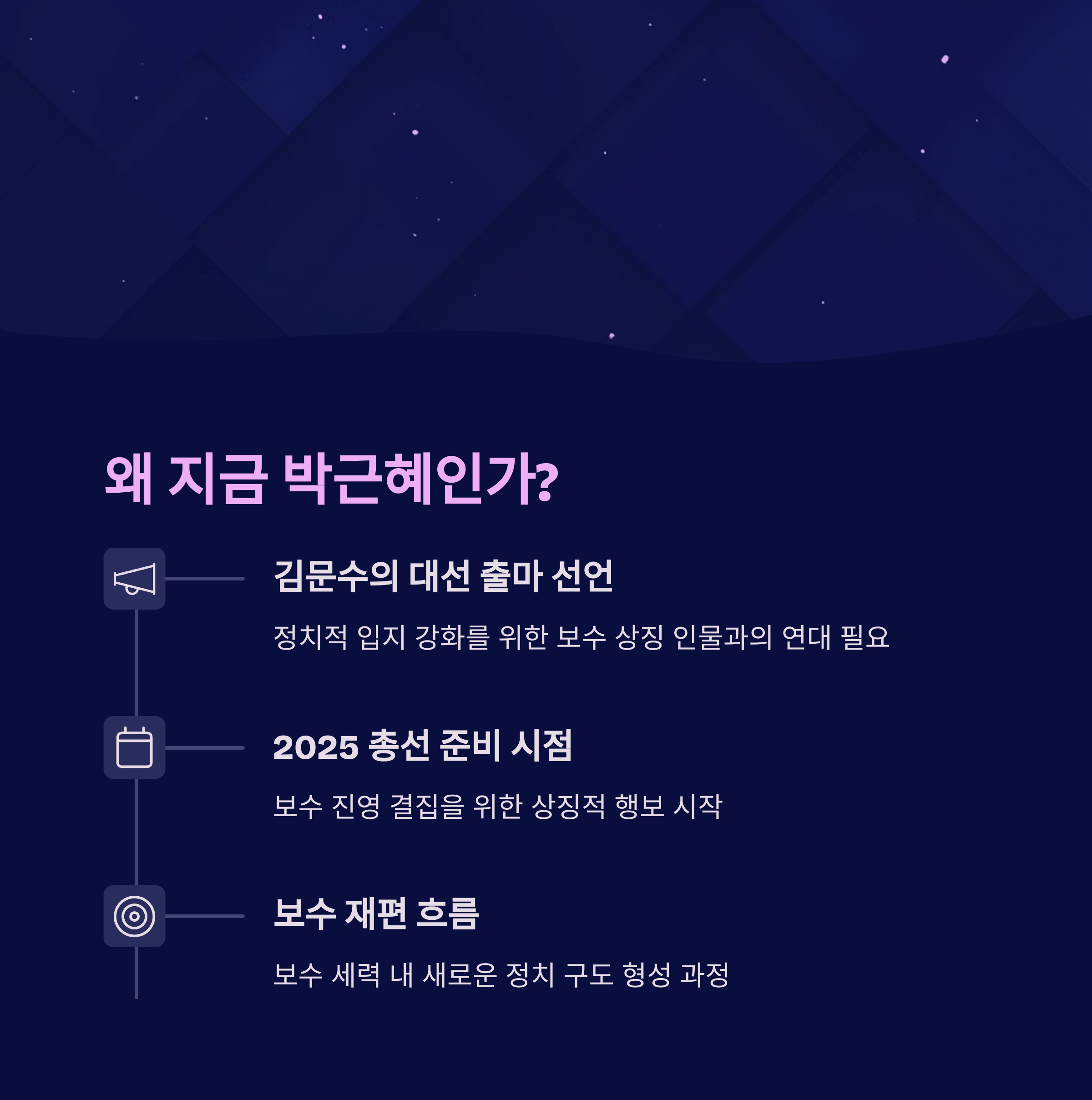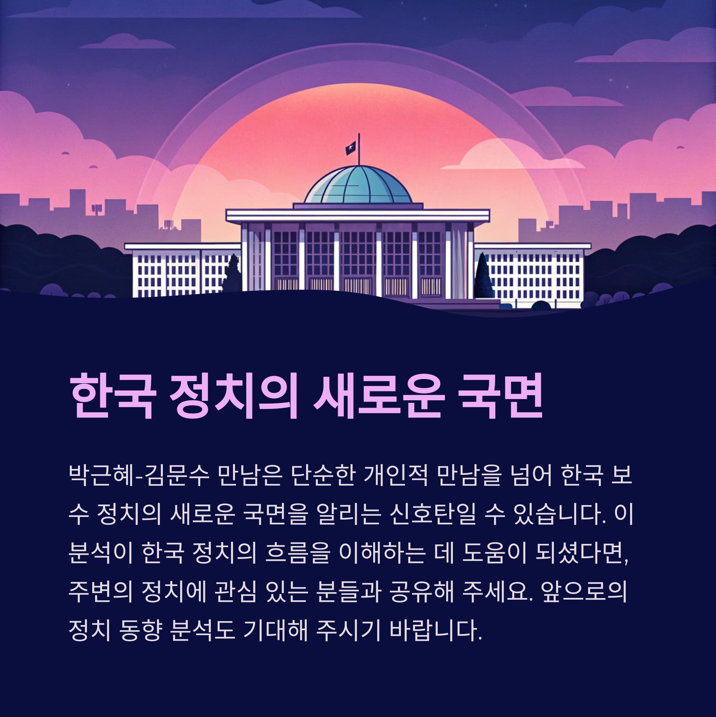 이 만남이 시사하는 정치적 의미는 단순한 '회동'을 넘습니다. 보수 세력 내부에서는 총선 및 대선 주자 간 정체성 경쟁이 본격화되고 있으며, 이 과정에서 ‘박근혜 라인’과의 관계 설정은 유권자에게 강력한 메시지를 전달할 수 있습니다.