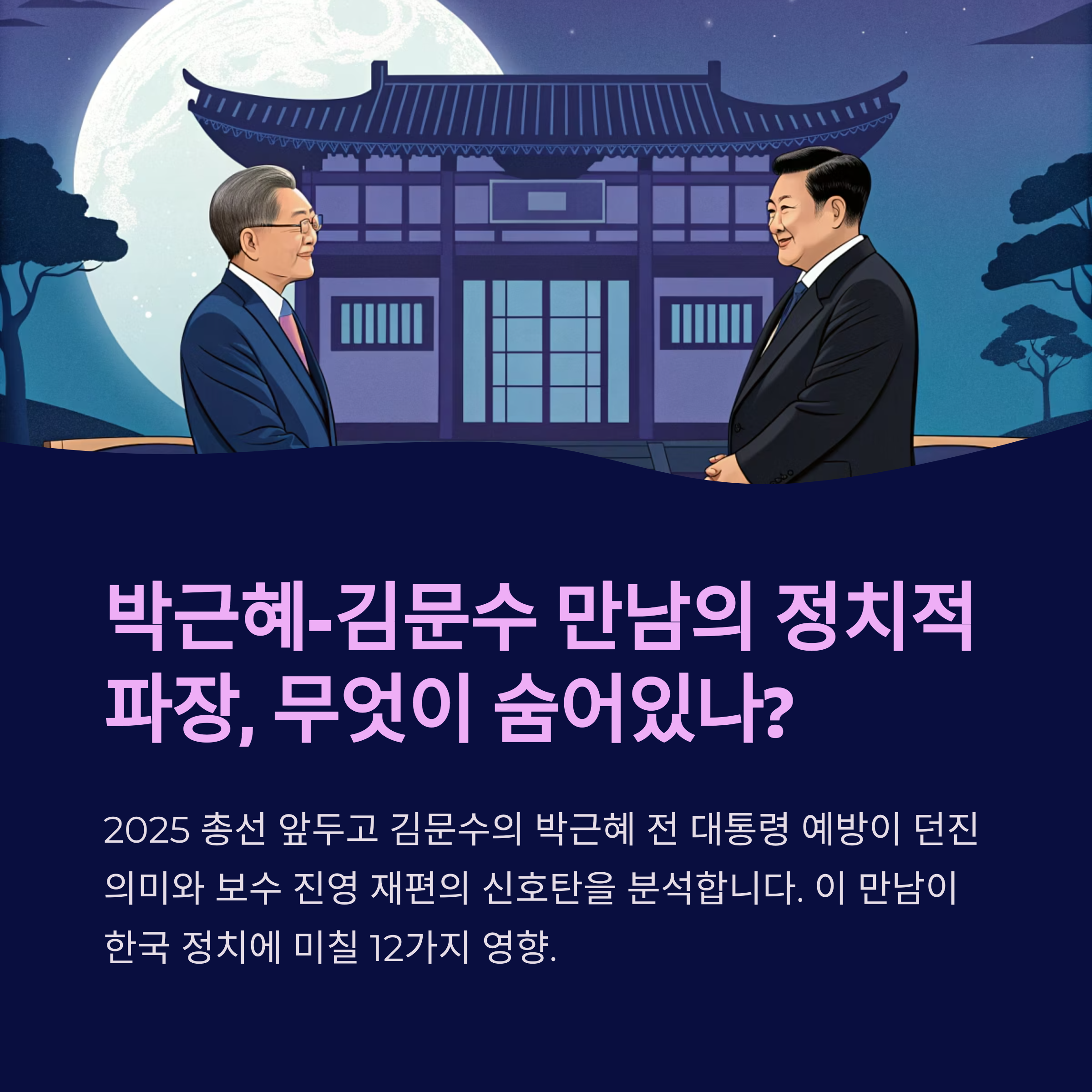 김문수 전 지사가 박근혜 전 대통령을 만난 시점은 결코 우연이 아닙니다. 그는 이미 차기 대권 도전을 선언했으며, 보수 진영의 전통성과 정통성을 상징하는 박 전 대통령의 영향력은 아직도 TK 지역과 보수층 유권자 사이에서 강력하게 작용하고 있습니다. 이 만남은 자신의 보수적 정체성을 재확인하고, 박 전 대통령의 '묵시적 지지'를 확보하려는 정치적 행보로 해석할 수 있습니다.