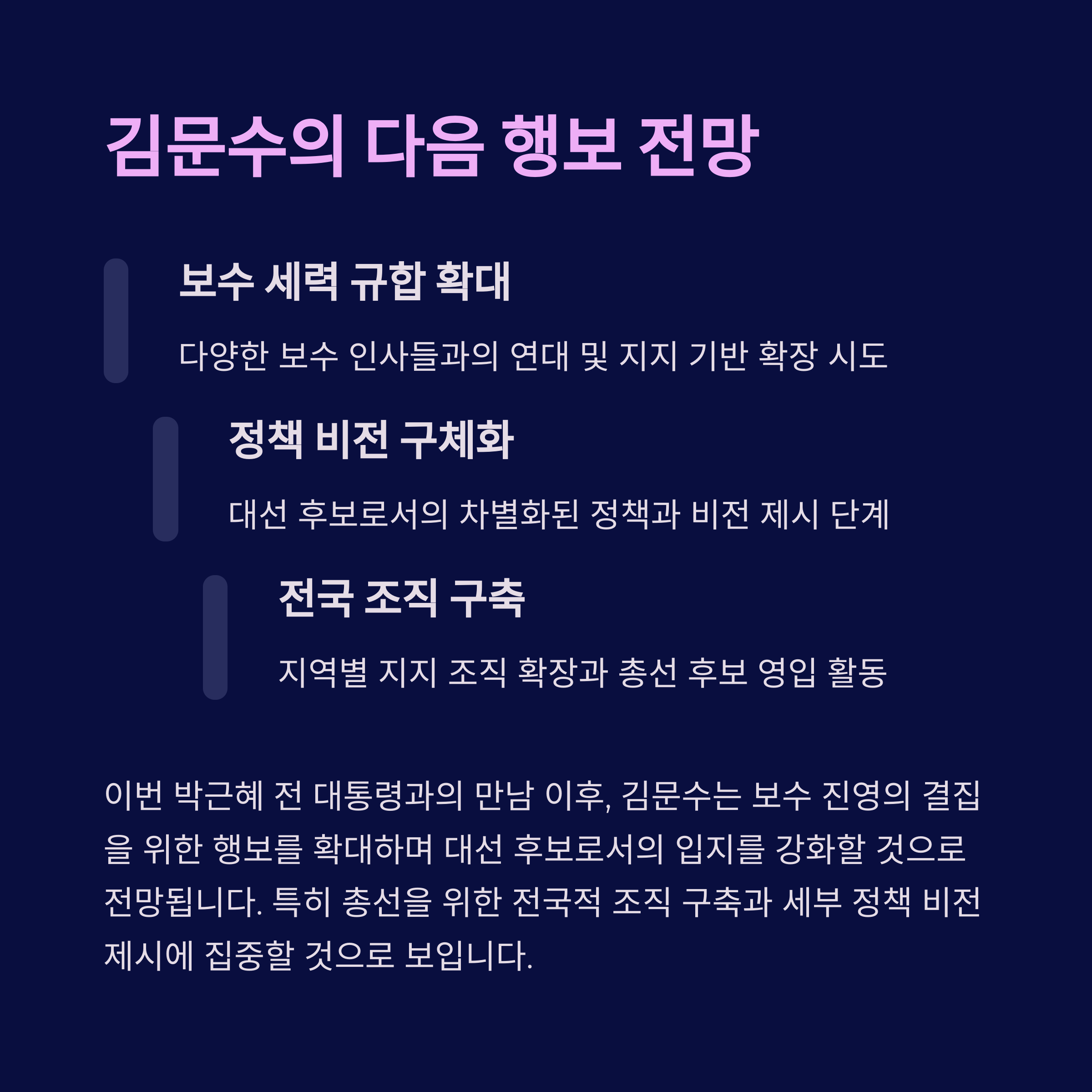 특히 박 전 대통령은 최근 정치적 메시지를 자제해왔지만, 특정 인사들과의 만남을 통해 보수 진영 내 미묘한 입장을 간접적으로 표현해왔습니다. 김 전 지사는 그 메시지를 전략적으로 활용해 보수 유권자들의 지지를 끌어올 가능성이 높습니다.
