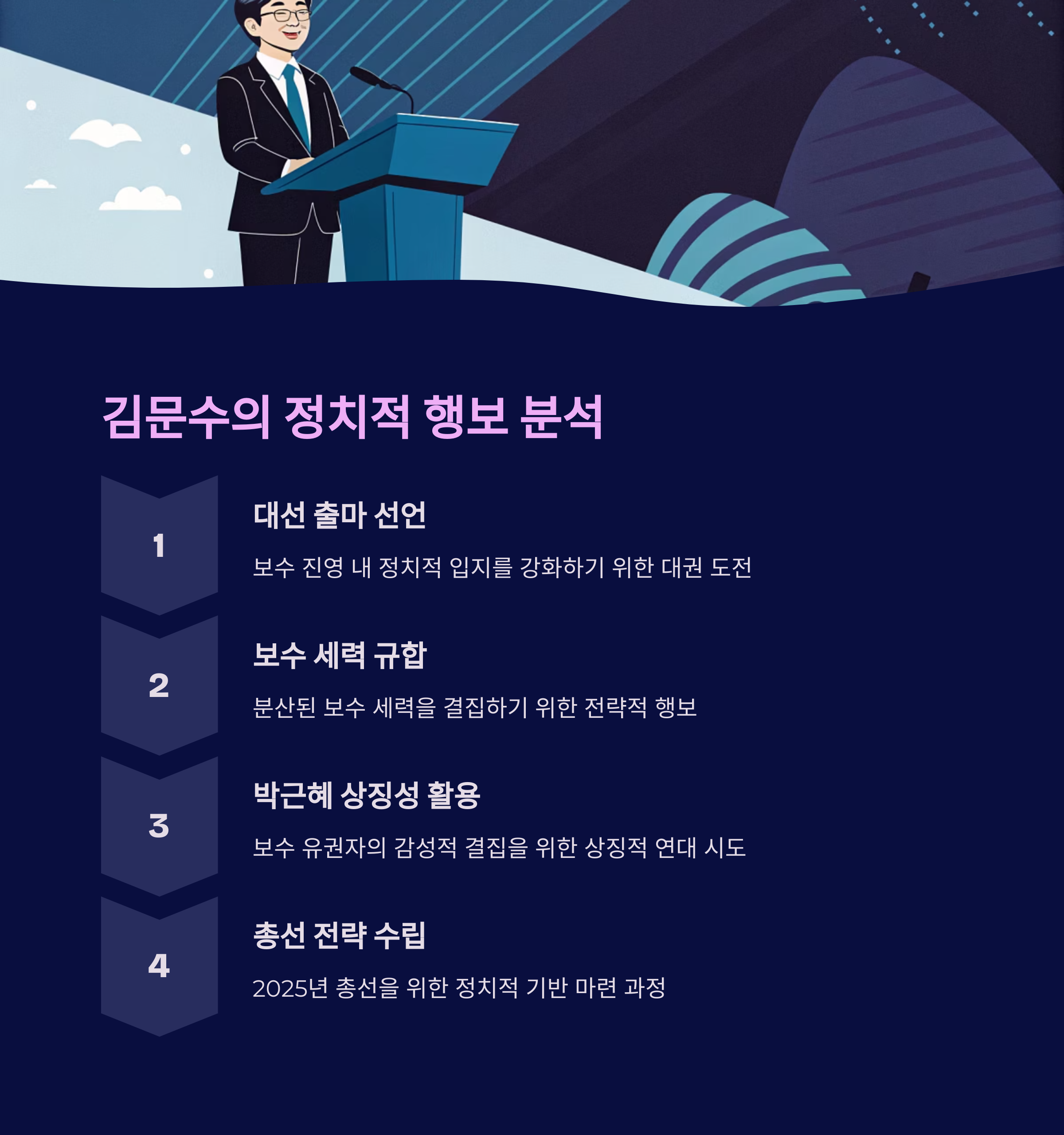 박 전 대통령의 침묵이 오히려 그 상징성을 강화시키고 있으며, 김 전 지사의 발언이나 행보는 이를 적극적으로 활용하려는 전략이 엿보입니다. 이와 같은 행보는 보수 진영 내 계파 재편성뿐 아니라, 유권자 결집 전략, 대선 구도 형성 등 여러 정치적 지점에 변수를 던지고 있습니다. 향후 윤석열 정부와의 관계, 친윤 vs 친박 구도의 전개 방향에 따라 김문수의 정치적 입지도 달라질 것입니다.