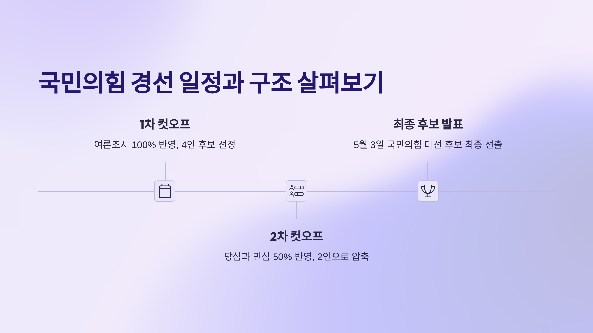 국민의힘은 1차 컷오프를 여론조사 100%, 2차를 당심과 민심 절반씩 반영하여 5월 3일 최종 후보를 선출할 예정입니다. 한덕수는 이후 출마를 공식화하고, 5월 중순경 단일화를 제안할 가능성이 제기됩니다. 과거 2002년 노무현-정몽준 단일화 사례와 유사한 흐름으로, 실제 단일화가 성사될 경우 판세를 뒤흔들 중요한 변수가 될 수 있습니다.