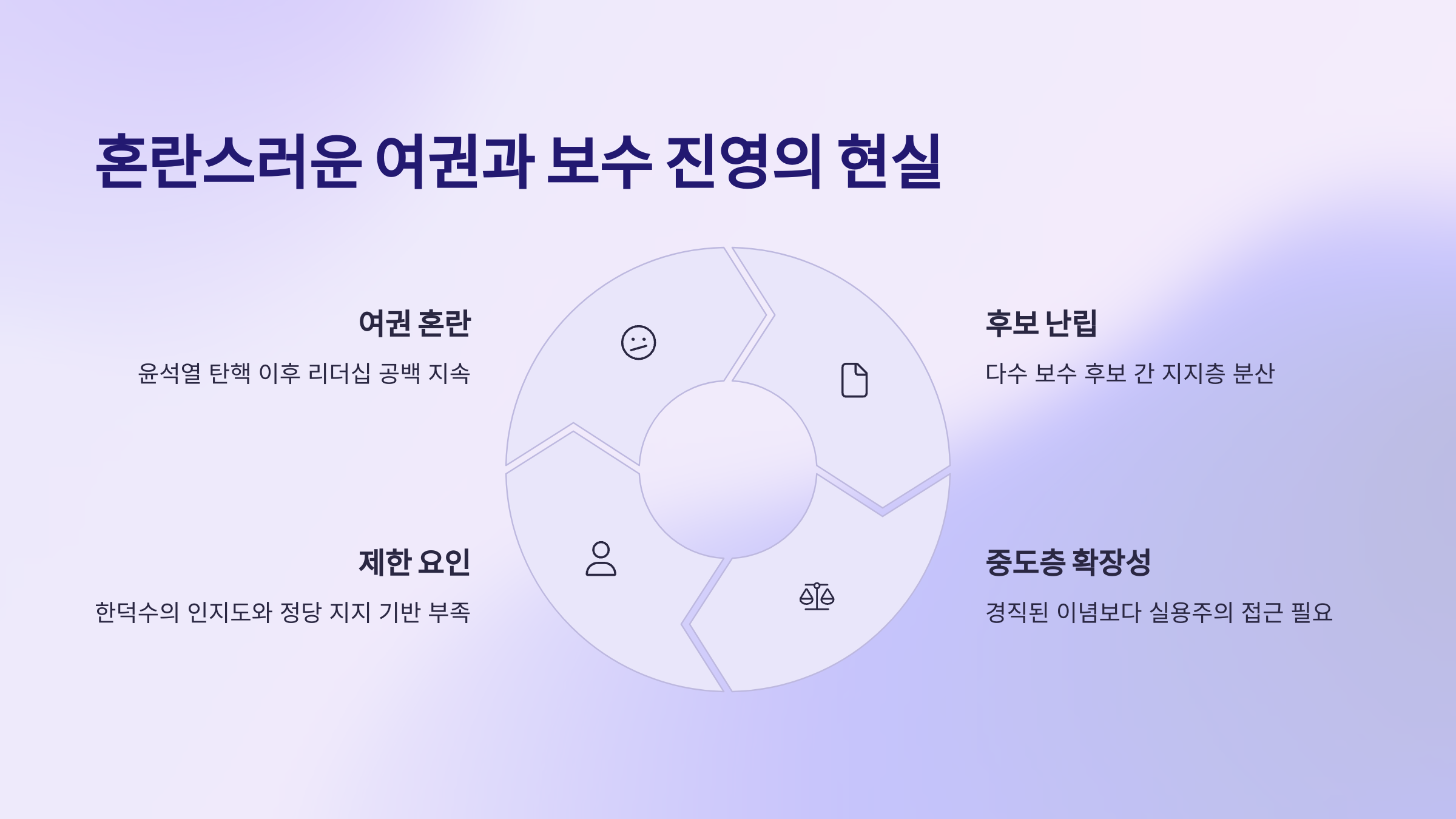 한편, 오세훈 등 기존 유력 후보들의 지지율 하락, 이재명 후보의 재판 문제 등은 보수 진영에게 기회와 위기를 동시에 안겨주는 요소로 작용하고 있습니다.