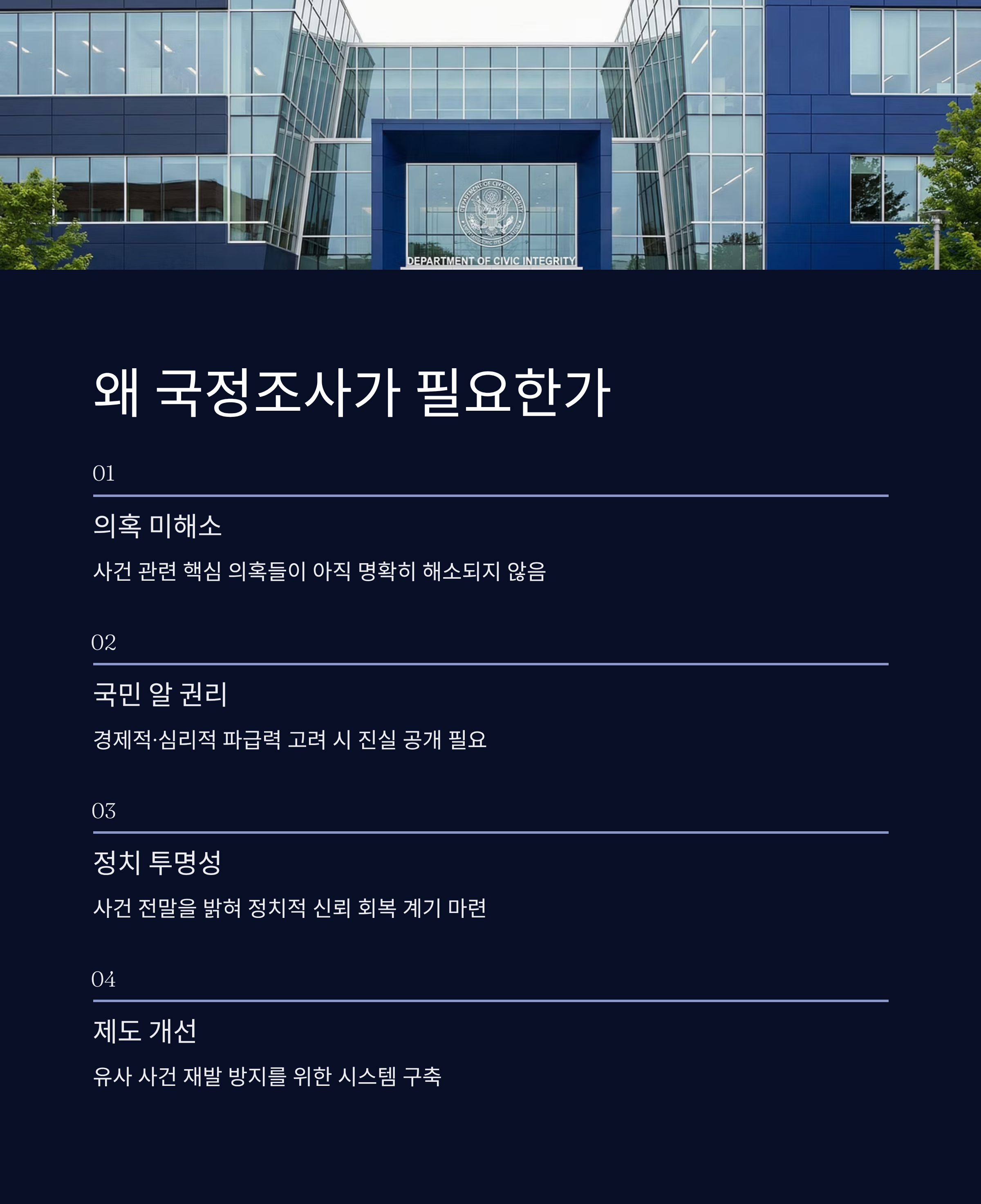 | A. 사건 관련 의혹이 아직까지 명확히 해소되지 않았고, 국민들에게 미치는 경제적·심리적 파급력을 고려할 때 국정 조사는 사건의 전말을 밝히고 정치적 투명성을 확보하기 위해 필요합니다. |
