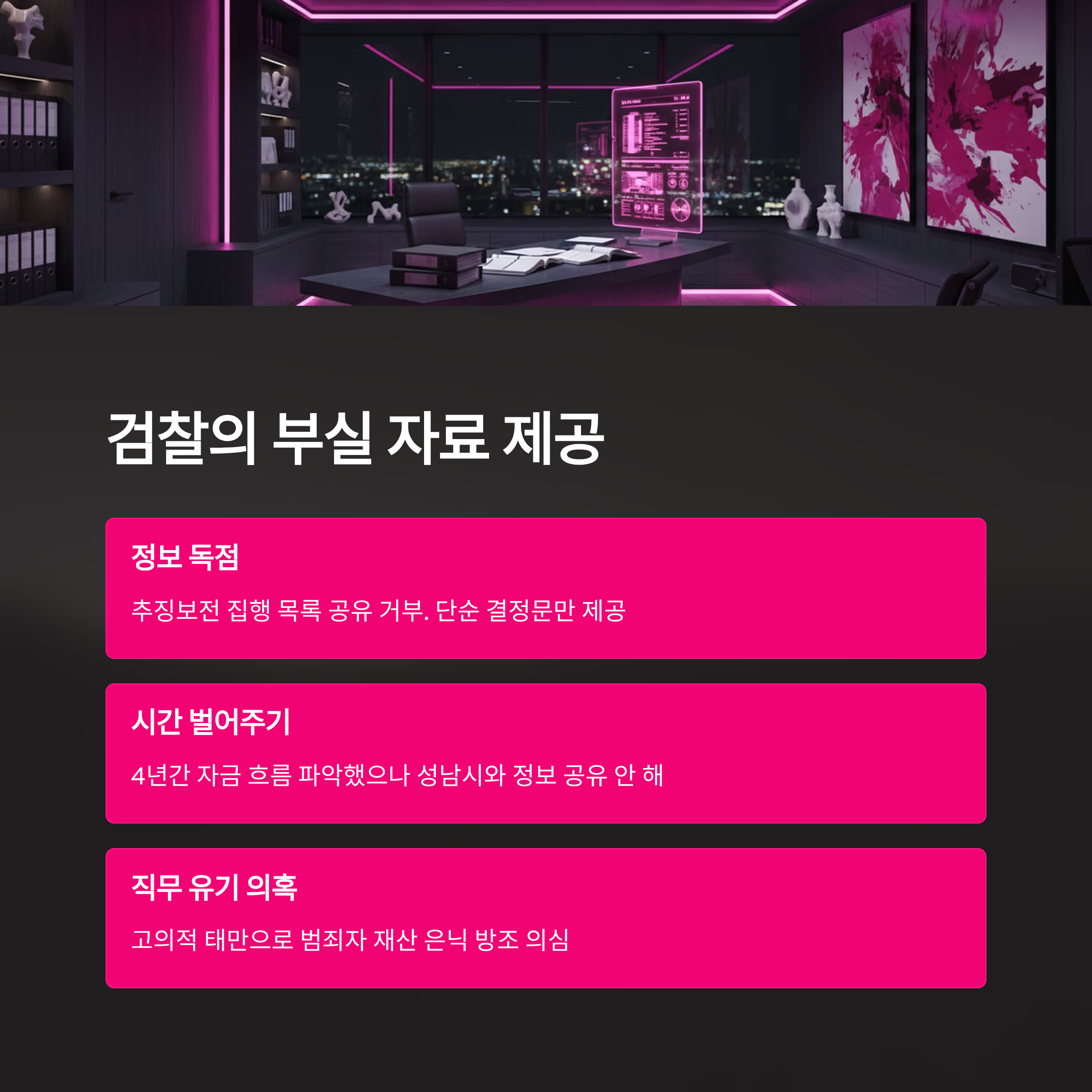 | A2. 성남시는 검찰이 범죄 수익 환수에 필요한 실질적인 정보인 '추징보전 집행 목록'을 공유하지 않았다고 비판합니다. 검찰이 자금 흐름을 파악하고 있었음에도 부실한 자료만 제공하여, 성남시가 적기에 자산을 동결할 기회를 놓치게 했다는 것입니다. 이는 검찰이 결과적으로 범죄자들의 재산 은닉을 방조했다는 의혹으로 이어지고 있습니다. |