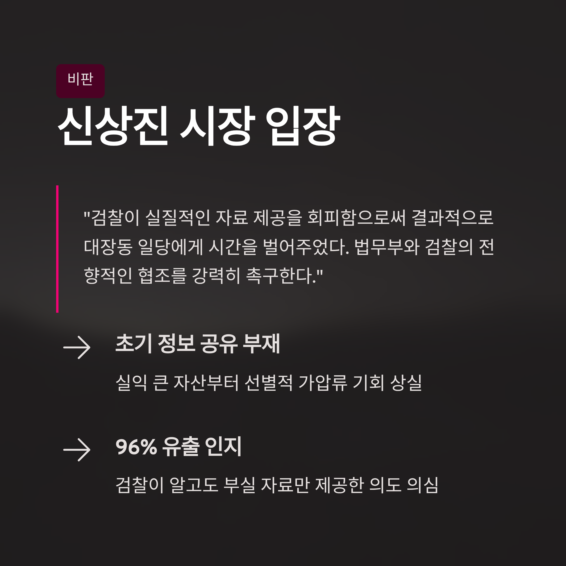 신상진 성남시장은 입장문을 통해 검찰이 실질적인 자료 제공을 회피함으로써 결과적으로 대장동 일당에게 시간을 벌어주었다고 강하게 비판했습니다. 만약 검찰이 초기부터 성남시와 긴밀하게 정보를 공유하고 협조했다면, 행정력을 집중하여 실익이 큰 자산부터 선별적으로 가압류할 수 있었을 것입니다. 검찰이 이미 96% 이상의 자금이 빠져나간 사실을 알고 있었으면서도 부실한 자료만 제공한 행위는, 단순한 행정 착오를 넘어 고의적인 업무 해태(懈怠)나 범죄자 비호가 아니냐는 의혹을 불러일으키고 있습니다.
